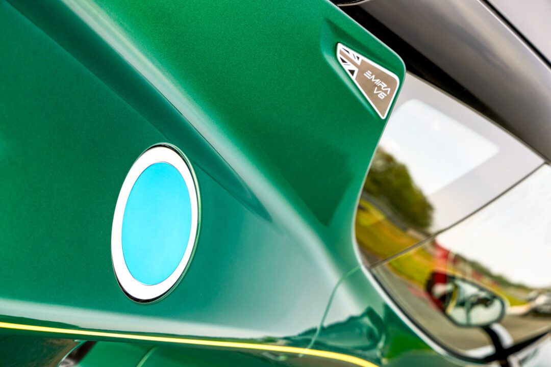 This isn’t just a paint job—it’s history retold in speed and steel. Dressed in Clark Racing Green, the Emira features a black roof, silver mirrors, and a bold yellow racing stripe inspired by the legendary Lotus Type 38 that took Indy by storm in 1965.