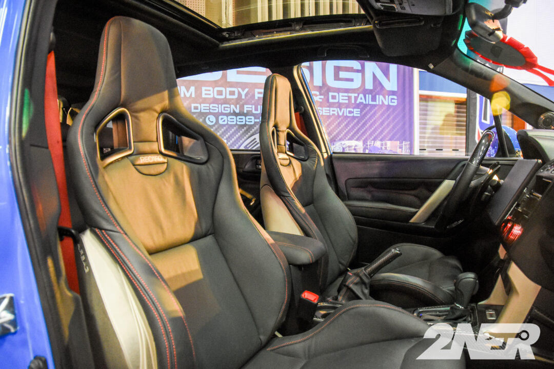 Inside, the Forester XT continued its theme of craftsmanship. Recaro Sportster Racing Seats anchored the driver and passenger, wrapped in gunmetal leather upholstery that blended luxury with performance. The carbon steering wheel, STI pedals, and red seatbelts injected racing DNA, while Defi gauges and Innovate Motorsports displays ensured the driver remained connected to every mechanical pulse.