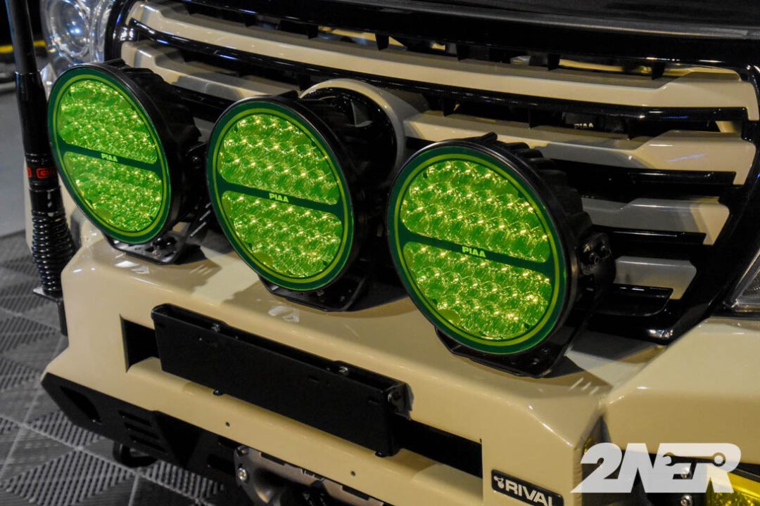 Its Cromax paint glistens under the lights, a flawless finish that highlights the vehicle’s muscular stance. Kut Snake flares widen its profile, while Black Rhino Wheels wrapped in the hybrid Nitto Ridge Grappler tires grip the ground with authority. Beneath it all, an OME BP‑51 suspension, Rival bumper, and PIAA lights make the LC200 unstoppable in the wild.