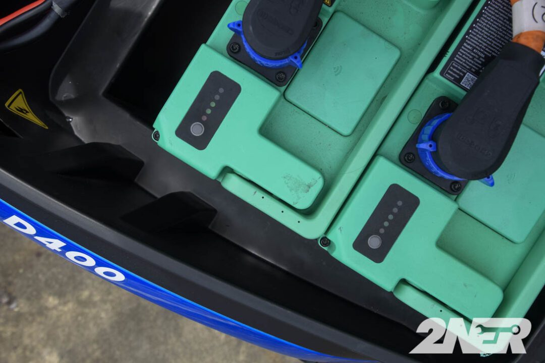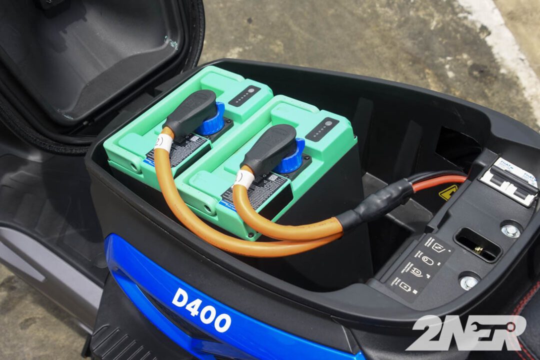 The D400 comes equipped with two swappable batteries, each offering around 90 km of range, giving you a combined distance of up to 180 km on a full charge.