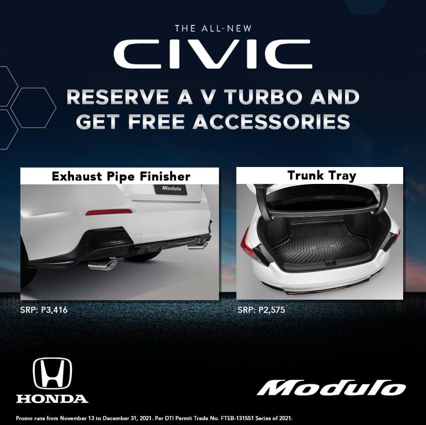 Notably, HCPI is offering customers the chance to purchase a Platinum White Pearl All-New Civic for all variants at no additional cost until November 30, 2021. Furthermore, customers who will reserve the All–New Civic V Turbo CVT Honda SENSING variant until December 31, 2021 are entitled to a free Modulo Trunk Tray and Modulo Exhaust Pipe Finisher on top of all other promotions offered for the month of the vehicle release until January 31, 2022.