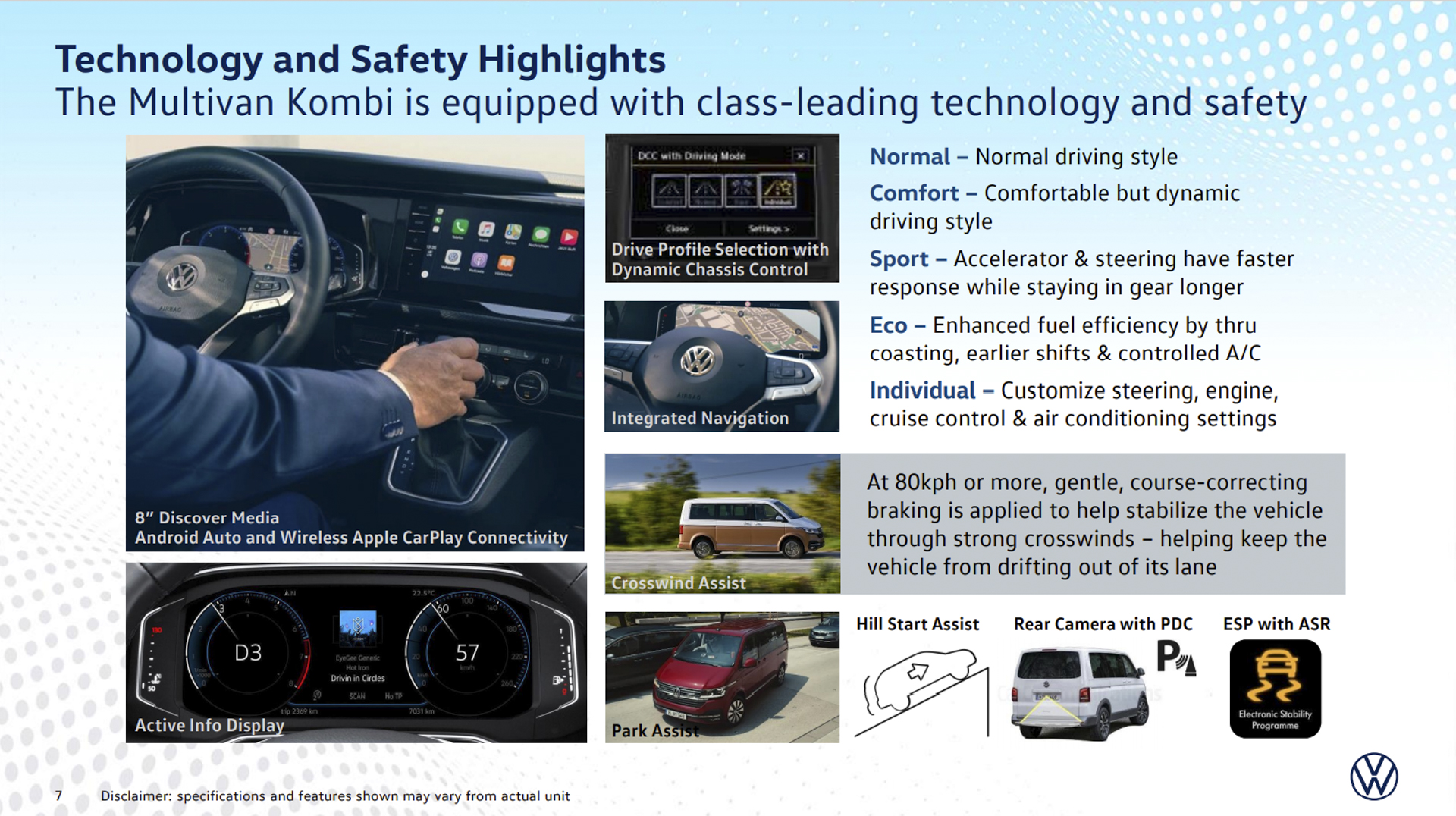 Faithful to its premium character, the Multivan Kombi makes occupant safety among its highest priorities. Apart from its 6 airbags (front, side, and head curtain) plus Driver Alert, Electronic Stabilization Program (ESP), Anti-Slip Regulation (ASR), Electronic Differential Lock (EDL), and Hill Start Assist (HSA), is the one-of-a-kind Crosswind Assist feature of the ESP that automatically applies gentle, course-corrective braking whenever strong crosswinds are encountered and the van is running above 80 kph, thereby helping keep the vehicle stable and running within its lane.