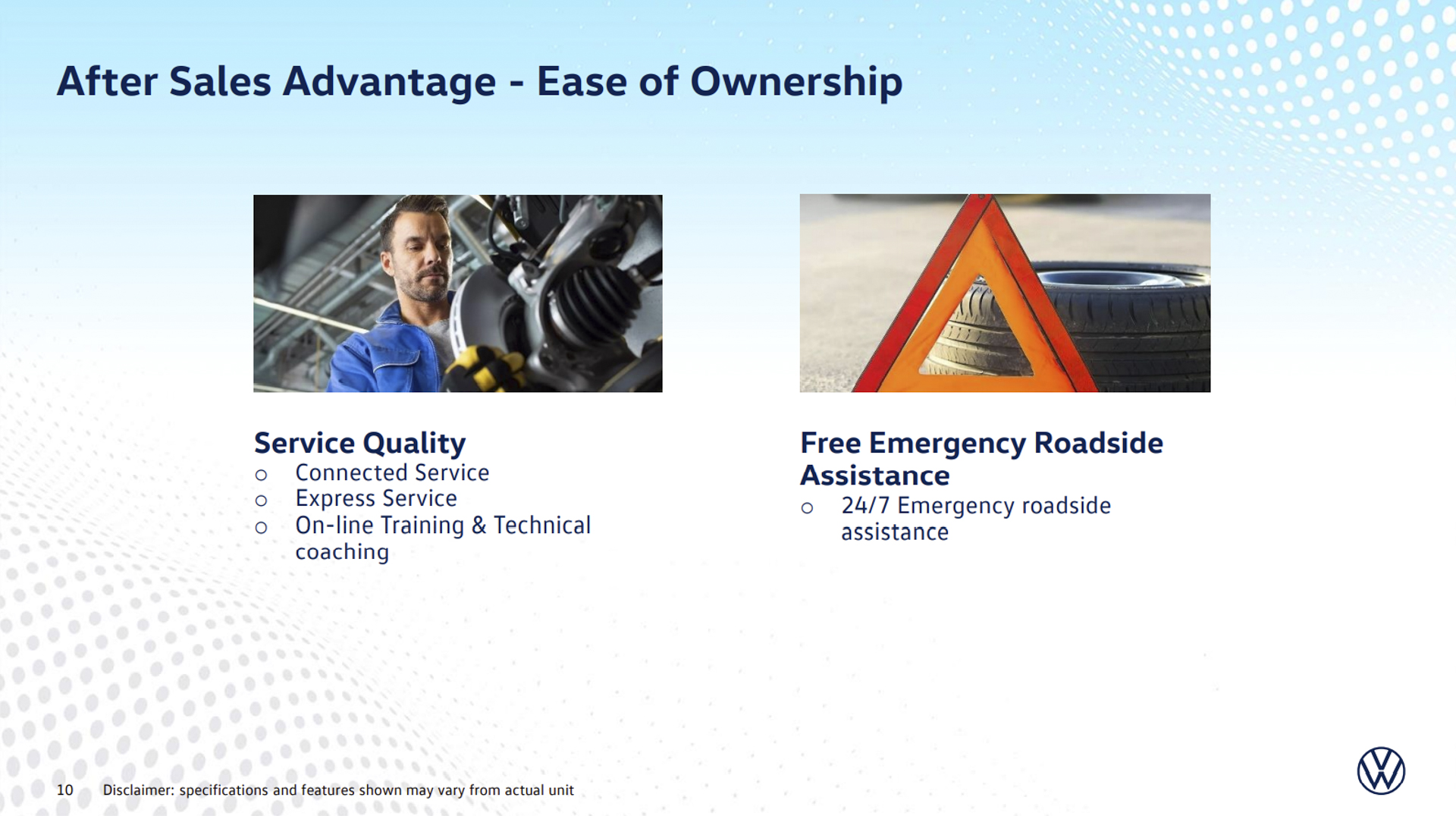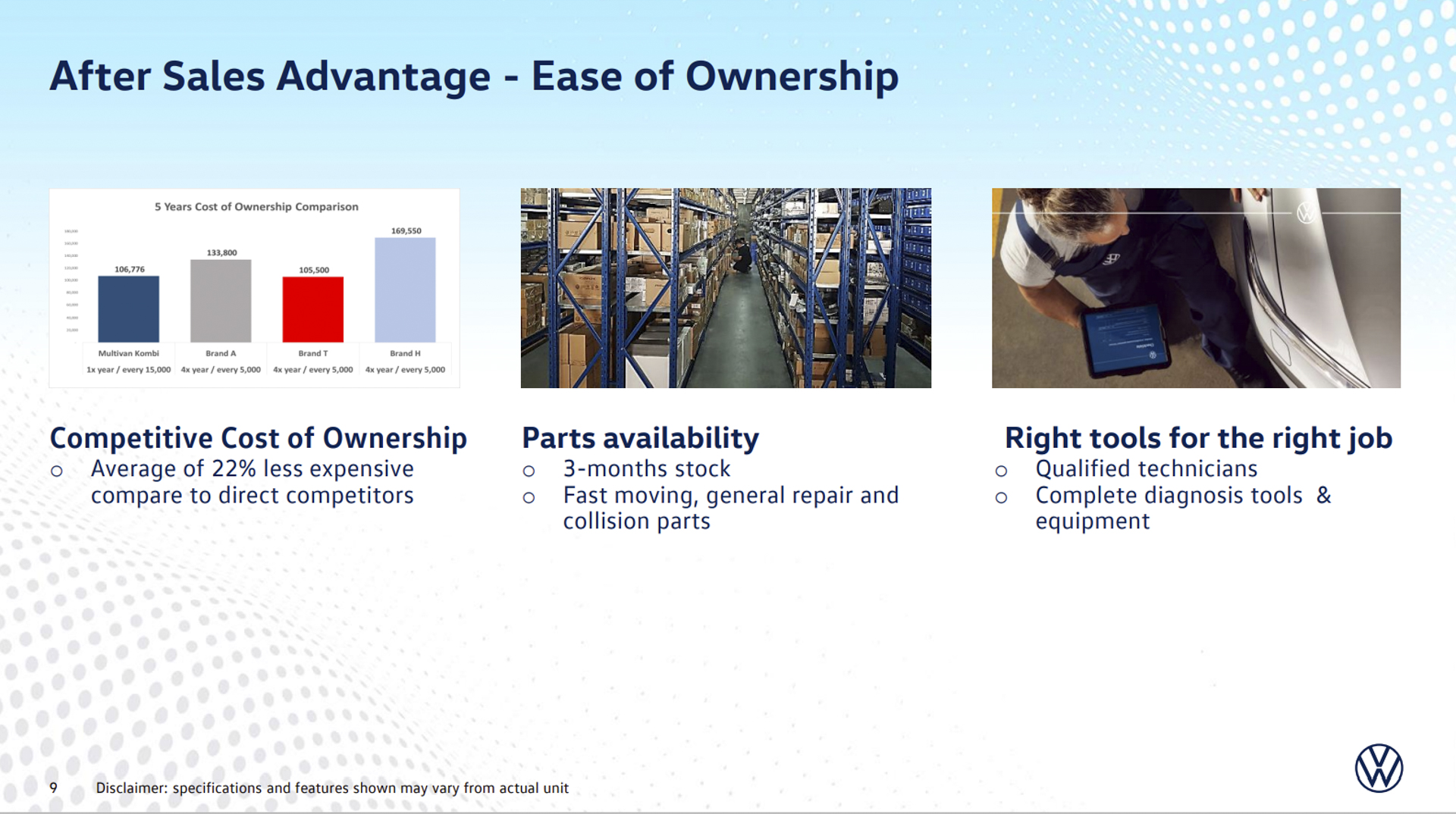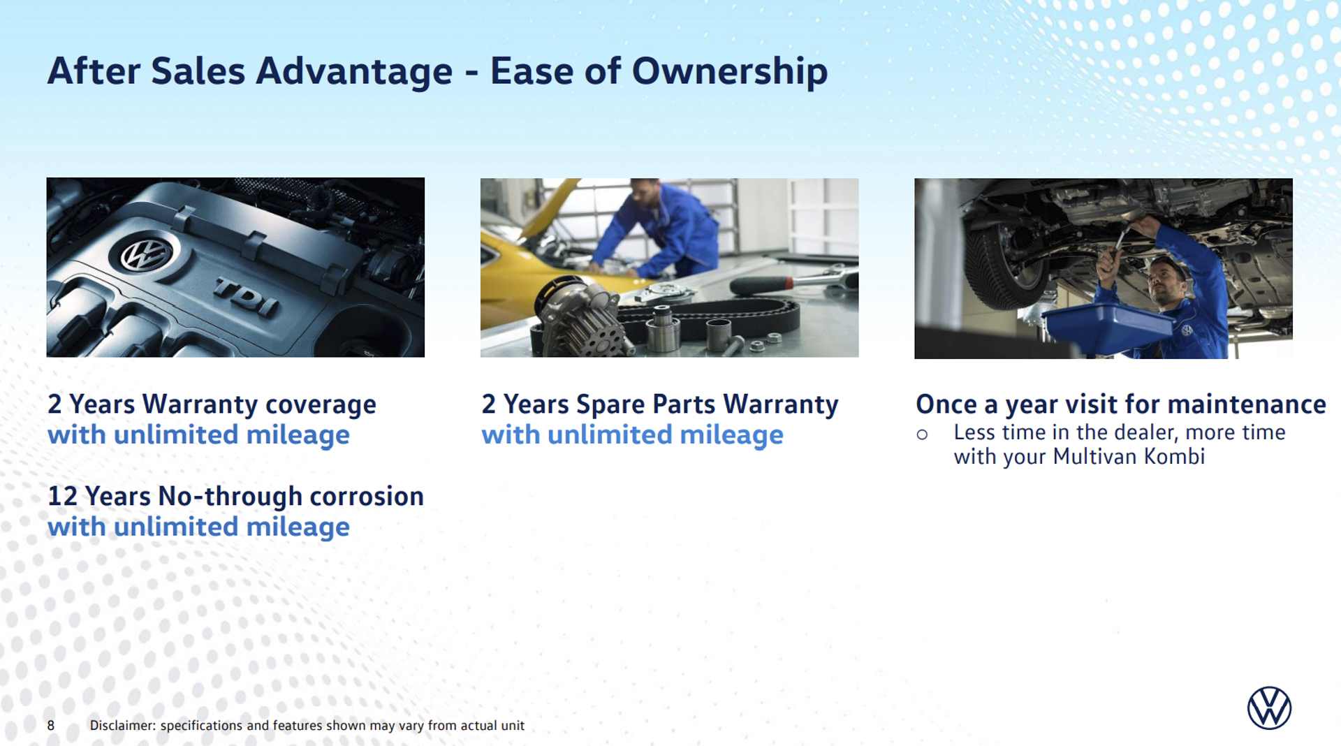 - Much like reason number 4, the Multivan Kombi lets you focus more time on what truly matters—your family—and less on maintenance and ownership costs. The Multivan Kombi comes with the 2-year warranty coverage, 2-year spare parts warranty, and a 12-year no-through corrosion—all with unlimited mileage. Its once-a-year visit for maintenance translates to less time spent for the vehicle to be serviced at the dealership. What’s more, Volkswagen dealers guarantee at least a 3-month stock availability on fast-moving parts, either for general repair or for collision parts. Dealers likewise guarantee the highest levels of service quality, employing only the most qualified technicians, their skills sharpened by extensive technical and online training, and using complete diagnostic tools and equipment. These dealerships have you covered even outside their premises, as they offer free 24/7 emergency roadside assistance. Overall, the only thing you get to spend more with your Multivan Kombi is your time enjoying its luxury, convenience and safety, as you actually spend 22% less on ownership costs compared to other top-tier luxury vans.