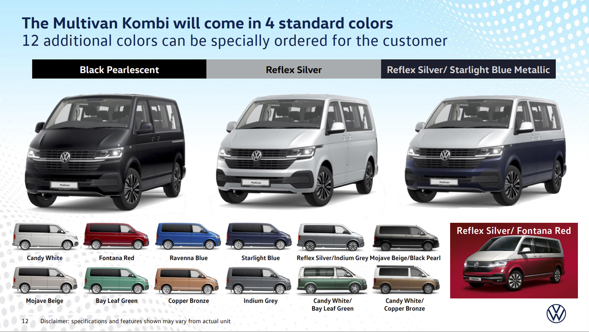 The Multivan Kombi Highline comes in four standard colors: Black Pearlescent, Reflex Silver, and the Bi-Colors Reflex Silver/Starlight Blue Metallic and Reflex Silver/Fontana Red. An additional 12 colors are available for special orders: Fontana Red, Ravenna Blue, Starlight Blue, Mojave Beige, Bay Leaf Green, Copper Bronze, Indium Grey, Candy White, and the Bi-Colors Reflex Silver/Indium Grey, Mojave Beige/Black Pearl, Candy White/Bay Leaf Green, and Candy White/Copper Bronze.