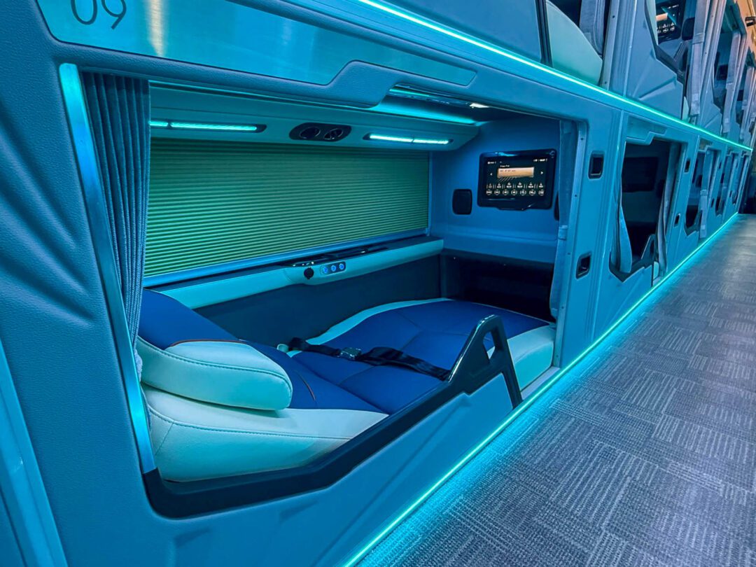 Amenities include LCD entertainment screens, bedroom lighting, Type A & C charging ports, and a well-appointed toilet. UV ceiling lights combined with ambient lighting add a touch of luxury, transforming every journey into a restful escape.