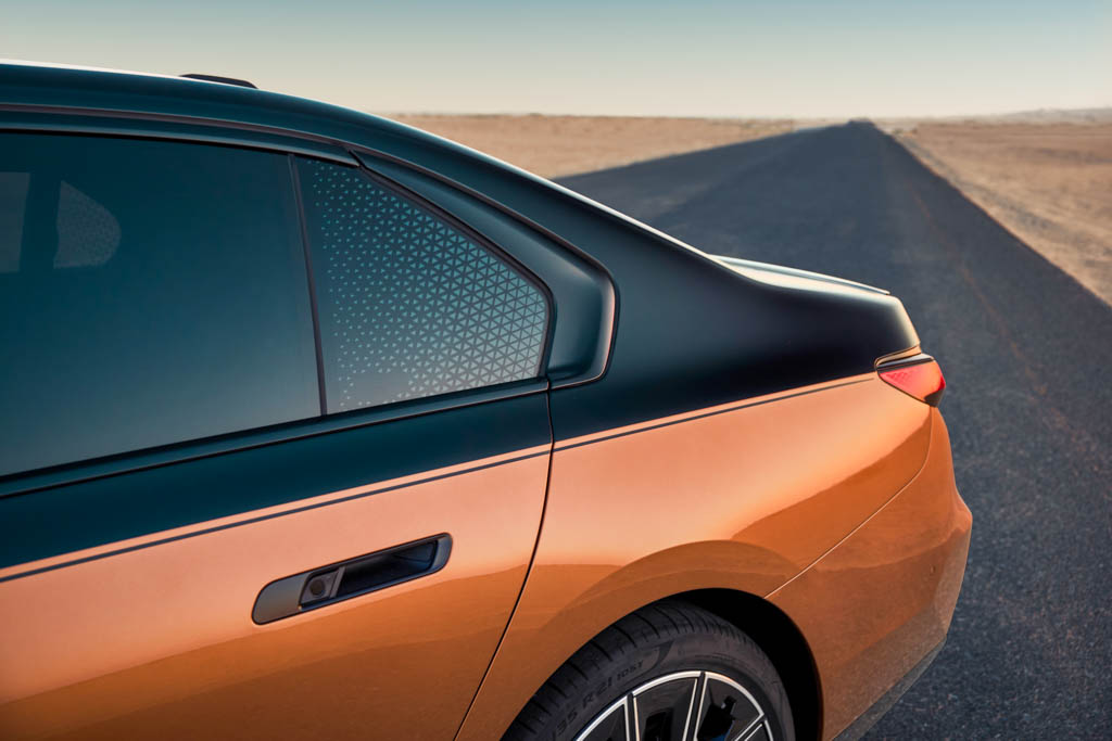 M-specific design features along the flanks and at the rear of the BMW i7 M70 xDrive clearly showcase the performance character of the top-of-the-range model variant. Eye-catching M side skirts, M logos with embellished borders on the front side panels, M High-gloss Shadowline trim and black M exterior mirrors with twin-stalk design add sporting flourishes.