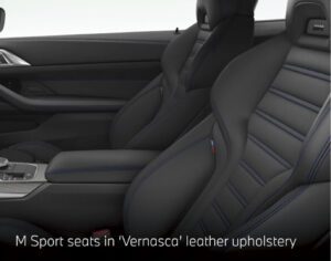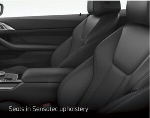 additional comforts, such as Leather Vernasca Upholstery, M Sport Seats with Lumbar Support, Sensatec material for the instrument panel, and the headliner in BMW Individual Anthracite. Additionally, an M Leather Steering Wheel, Interior Trim Finishers in Aluminum Tetragon, and M Seat Belts add the finishing touches. The instrument cluster and Control Display in the all-new BMW 4 Series Coupé form a largesurface display grouping. The start/stop button for the engine is now positioned in a classy control panel in the center console. And the model- specific rear seats with integral head restraints and pronounced individual- seat character have been designed to accommodate two passengers.