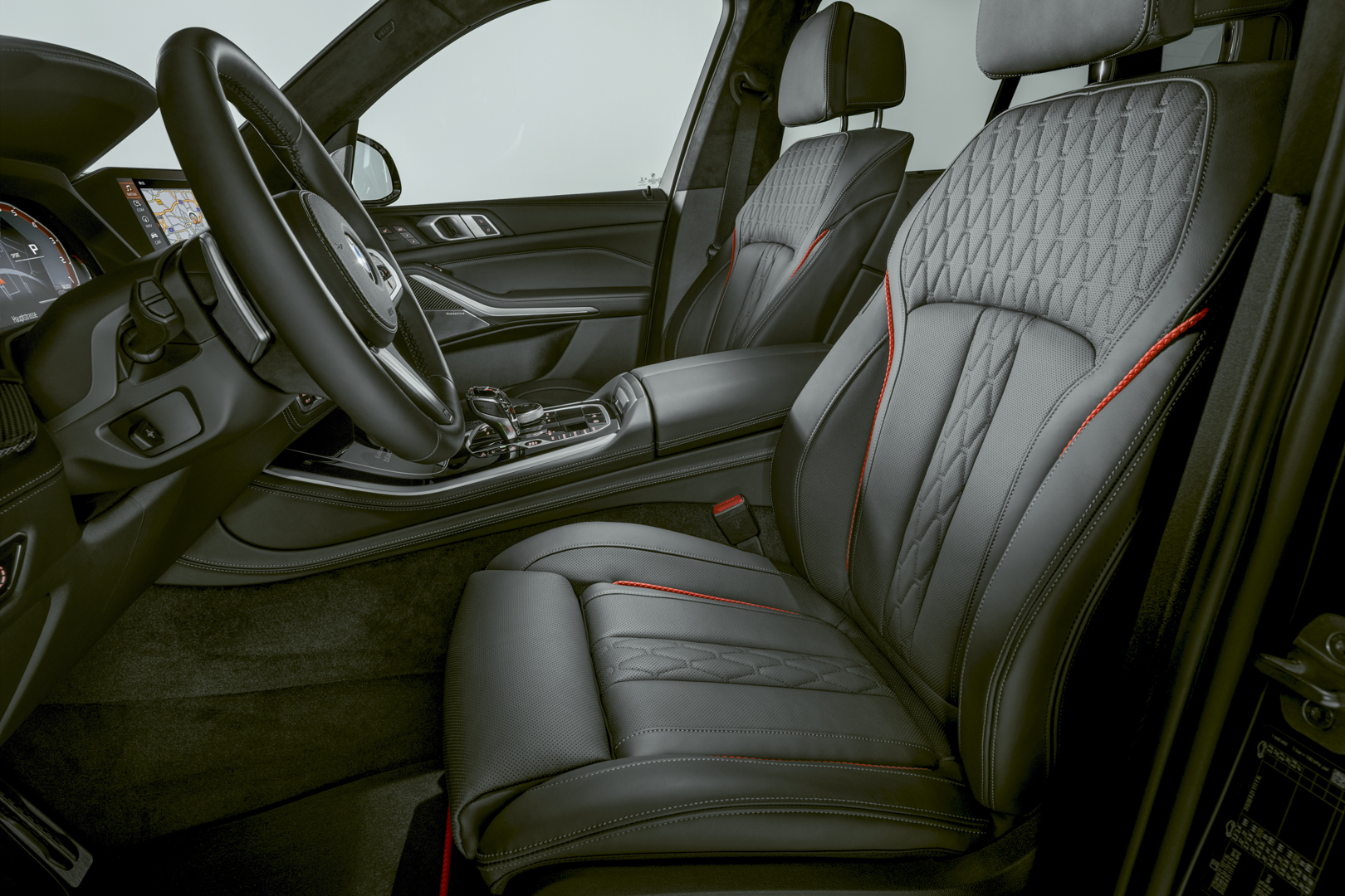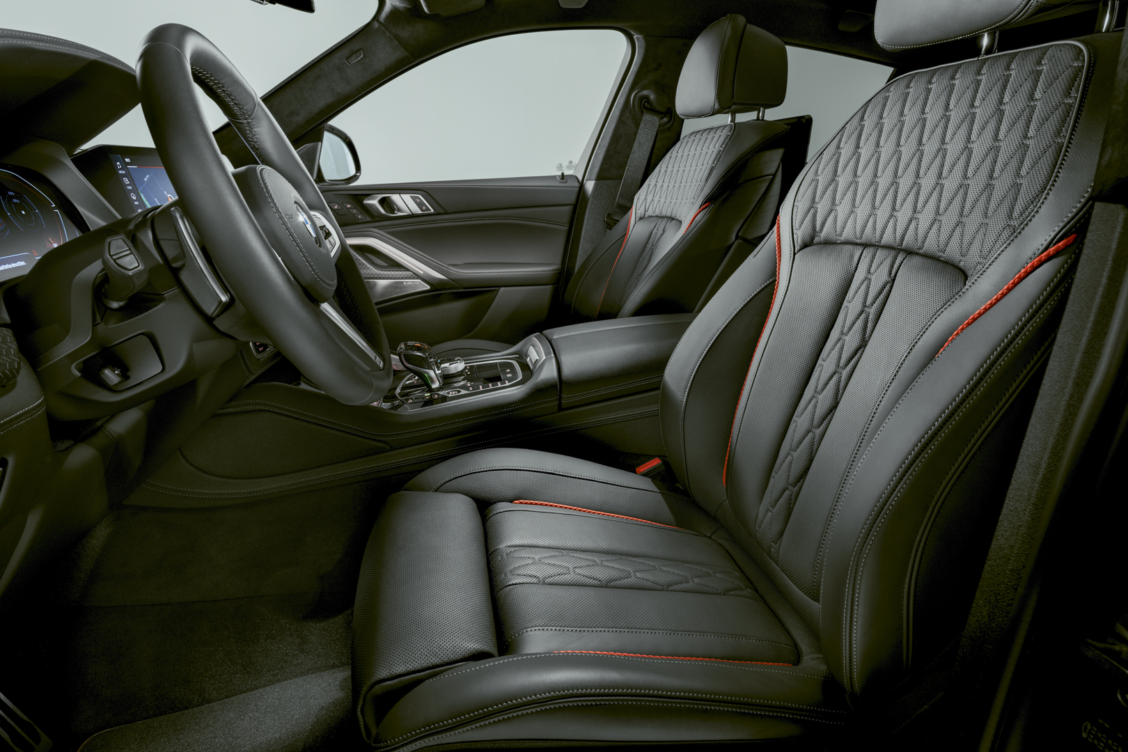 The central focus of the Black Vermilion edition is the interplay between the colours black and red. For example, the BMW double kidney grille with model-specific red bars creates an effective contrast to the BMW Individual special paint finish Frozen Black metallic. On the BMW X6 Black Vermilion this visual highlight is expressed in a particularly impressive way in combination with its kidney grille Iconic Glow. The M headlights Shadow Line with BMW laser light, including accented lighting with blue X signature, complete the distinctive look of the front end. Moreover, on the exterior, the M Sport Package emphasises the dynamic character of the BMW X5 and X6 Black Vermilion editions. It comprises, among other things, specific front and rear aprons as well as the M high-gloss Shadow Line with extended options. Behind the Orbit Grey matt, 22-inch, double-spoke 742 M light alloy wheels with mixed tyres designed exclusively for these edition models, red high-gloss M Sport brake callipers stand out as a striking visual highlight.