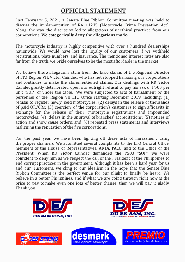 Last February 5, 2021, a Senate Blue Ribbon Committee meeting chaired by Senator Gordon was held to discuss the implementation of RA 11235 (Motorcycle Crime Prevention Act). Somewhere along the way, the discussion which was supposedly focused on the delayed distribution of plate numbers by the LTO, led to allegations of so called unethical practices of our corporations. The allegations pertain to alleged irregular repossession practices, high interest rates, withholding the OR/CR, insurance, and plate numbers from our customers. At the outset, we categorically deny these allegations. Though we are confused as to how these allegations pertain to the implementation of RA 11235 (Motorcycle Crime Prevention Act), we are nevertheless prepared to answer questions from the Senate Blue Ribbon Committee.