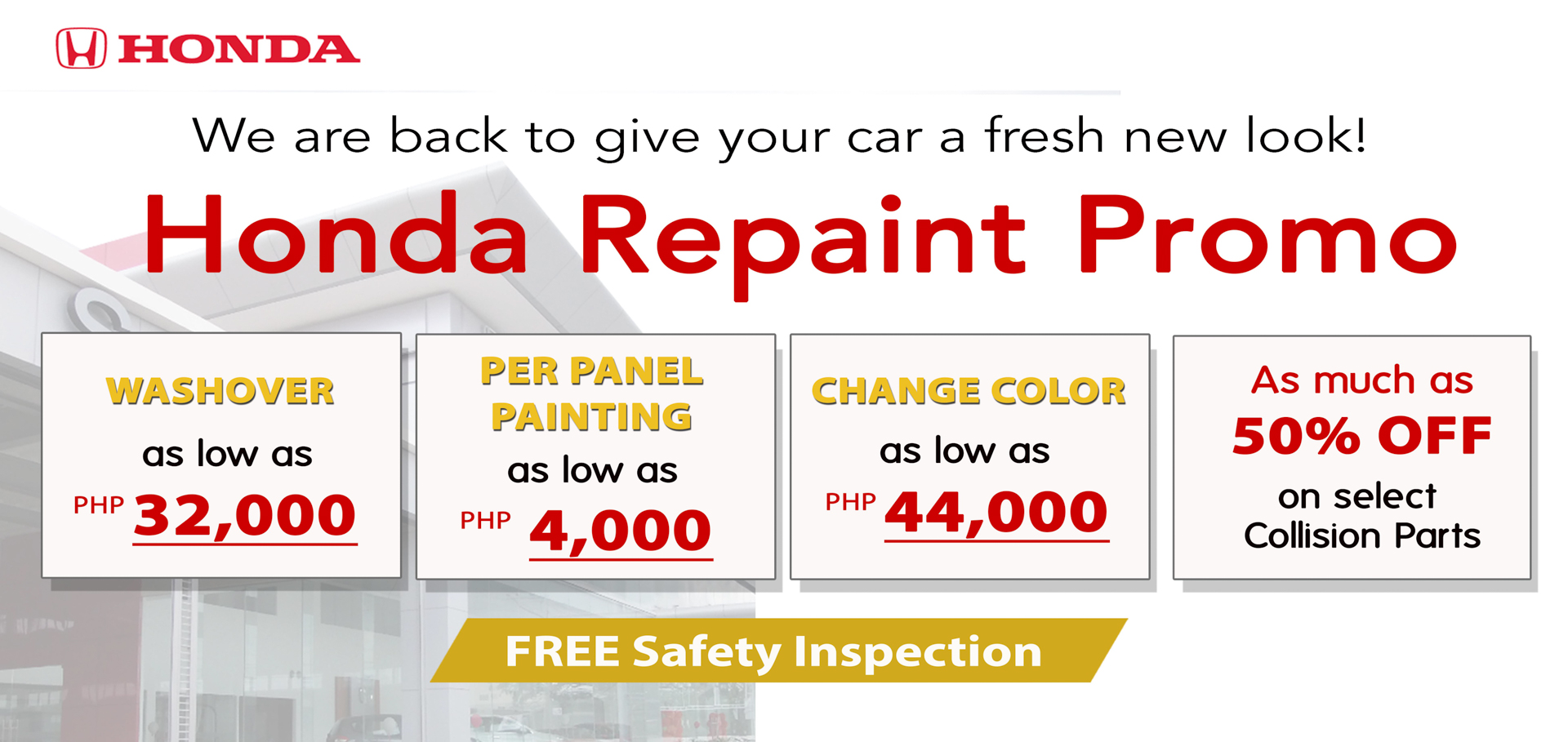 In addition, customers may avail of as much as 50% discount on collision parts for select Honda car models and Free 20-Point Safety Check-up.