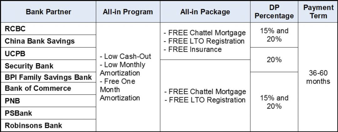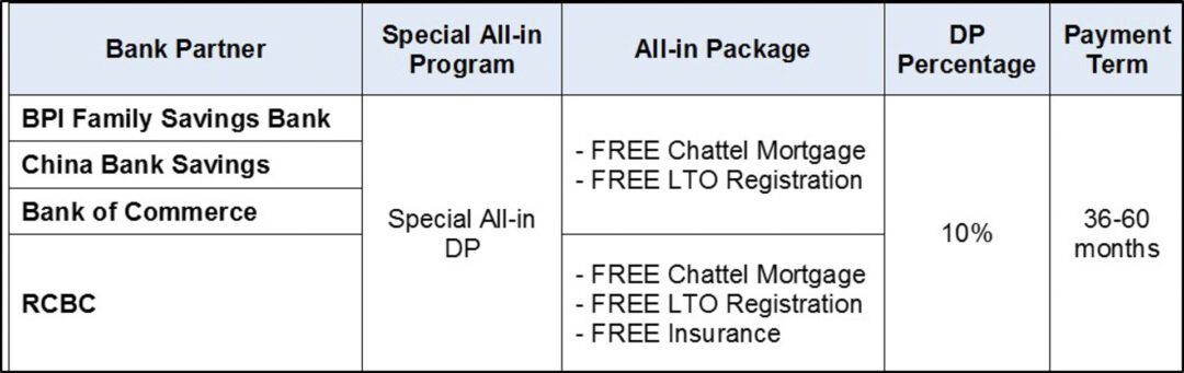 All these offers include a three (3) year LTO Registration and Chattel Mortgage and a free one (1) year Comprehensive Insurance with Acts of Nature through select bank partners.