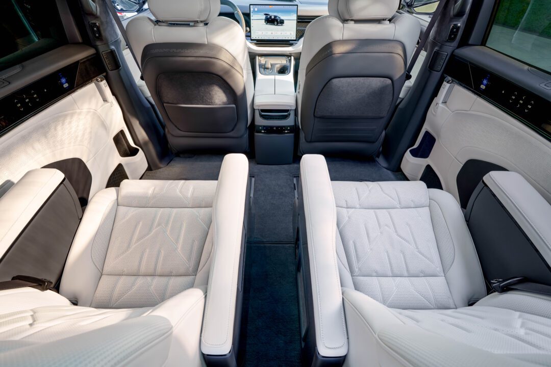 Step inside to experience Sofaro First-Class Airline Seats wrapped in premium Nappa leather, complete with massage functions for both front and rear occupants. A foldable center table, dual OLED displays (15.05” central + 17” overhead), and ambient lighting transform the cabin into a high-tech sanctuary on the move.