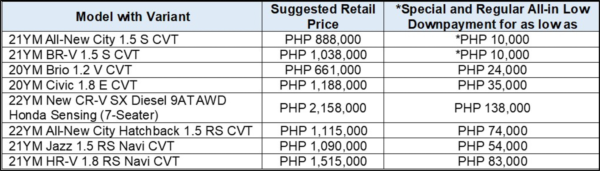 For the All-New City (sedan), BR-V, Brio, Civic, New CR-V, All-New City Hatchback, Jazz, and HR-V, customers may avail the following special all-in, and regular all-in low downpayment offers: