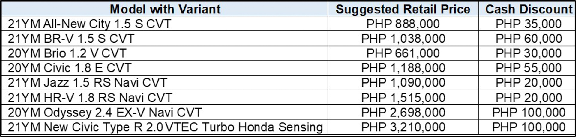 Customers who would like to avail the All-New City (sedan), BR-V, Brio, Civic, Jazz, HR-V, Odyssey, and New Civic Type R may enjoy the following cash discounts: