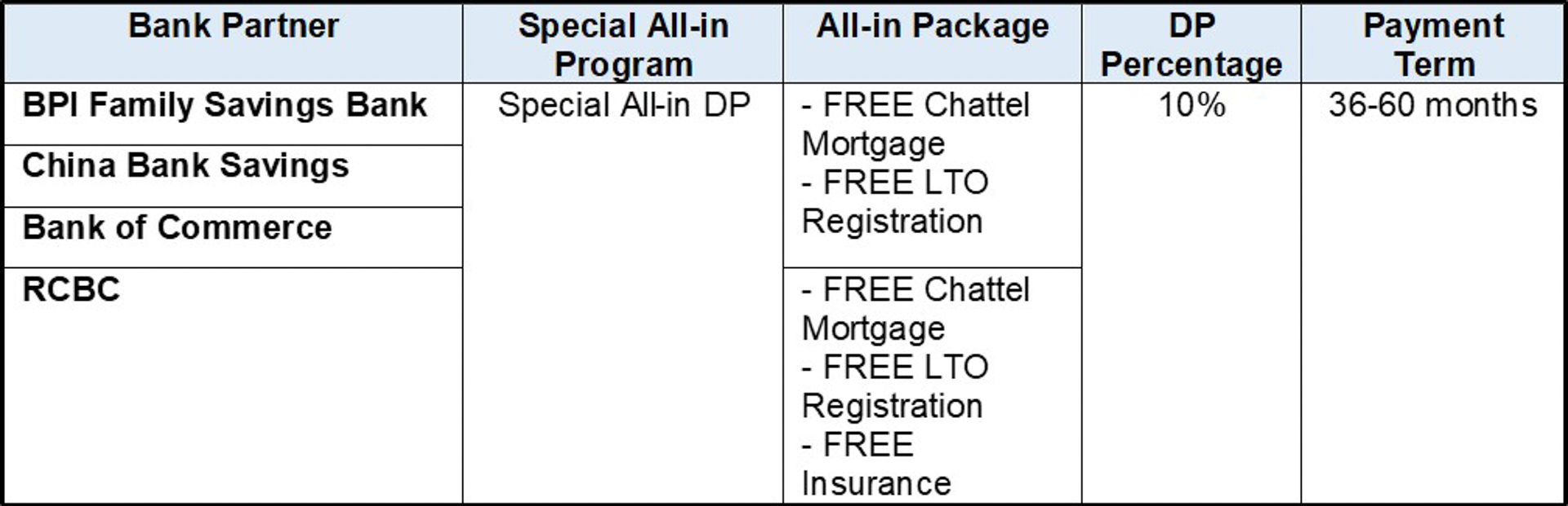 A special all-in financing program is applicable for 10% downpayment with 36-60 months payment terms for select models are available with the following details: