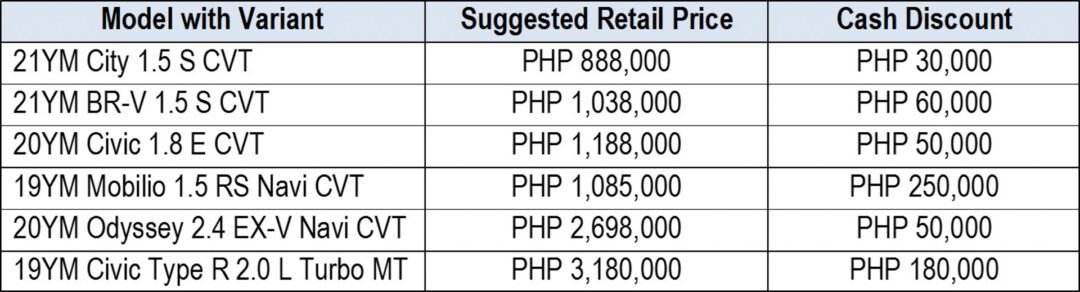 For City, BR-V, Civic, Mobilio, Odyssey, and Civic Type R, customers may enjoy the cash discounts below: