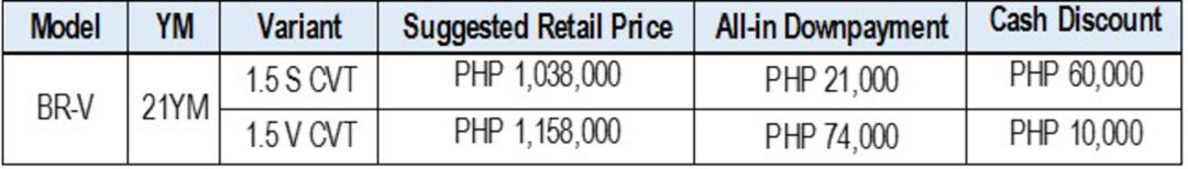 The BR-V PMS program is on top of the current cash discount and financing promos available this month. Customers may enjoy this exclusive offer with the following suggested retail prices.