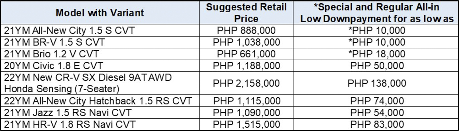For the All-New City (sedan), BR-V, Brio, Civic, New CR-V, All-New City Hatchback, Jazz, and HR-V, customers may avail the following special all-in, and regular all-in low downpayment offers:
