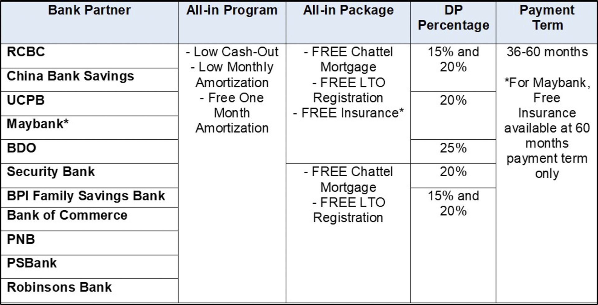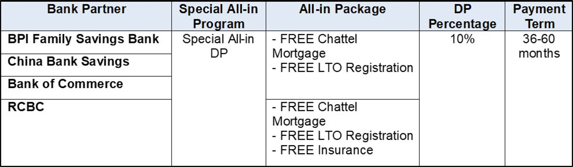 All these offers include a three (3) year LTO Registration and Chattel Mortgage and a free one (1) year Comprehensive Insurance with Acts of Nature through select bank partners.