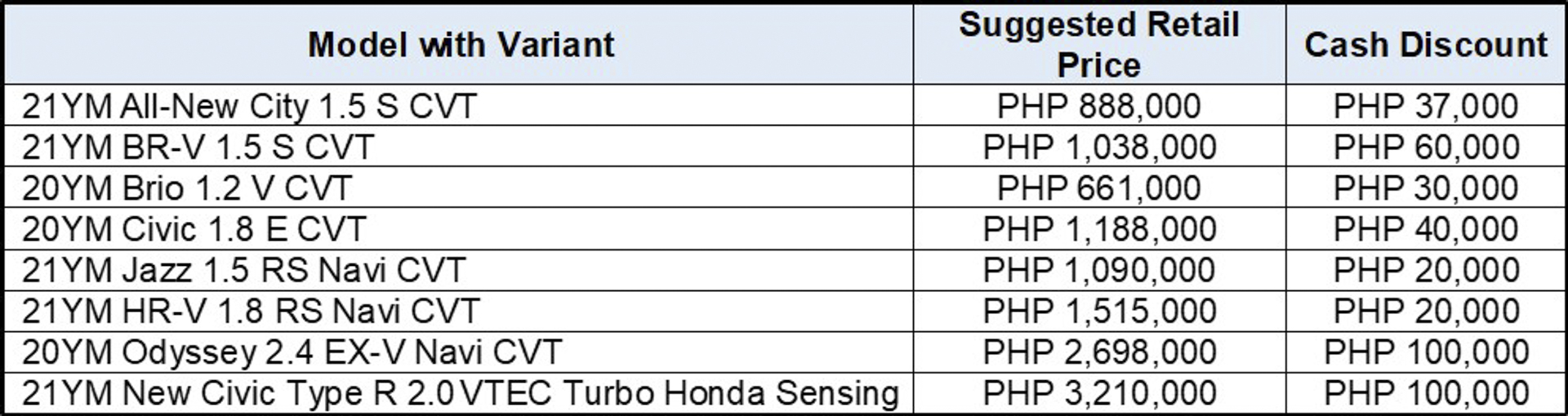 Customers who would like to avail the All-New City (sedan), BR-V, Brio, Civic, Jazz, HR-V, Odyssey, and New Civic Type R may enjoy the following cash discounts: