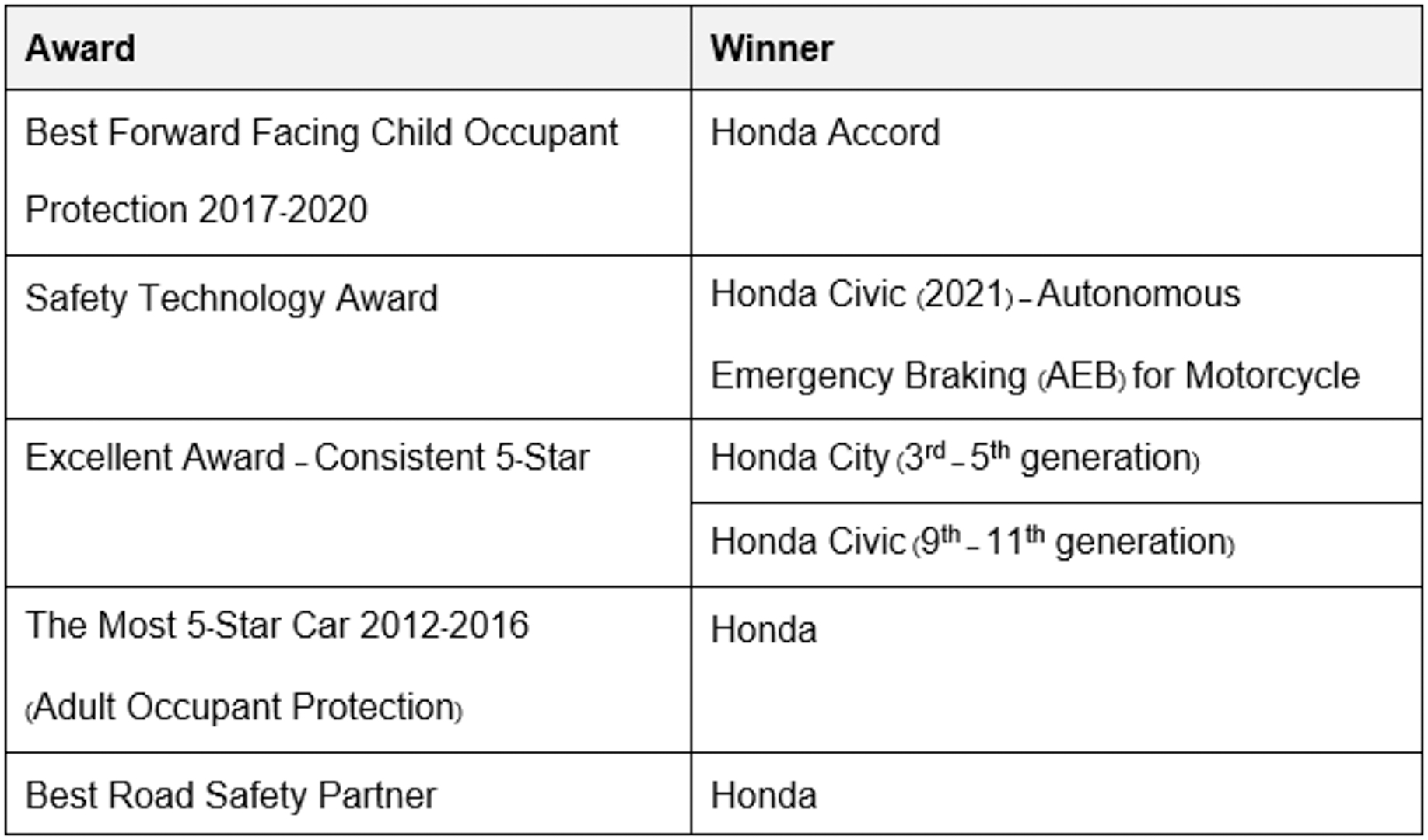 In conjunction with the 10-year anniversary, ASEAN NCAP announced various awards, the Decade of Vehicle Awards, to several vehicle manufacturers. Honda is the most successful manufacturer with total 6 awards including: