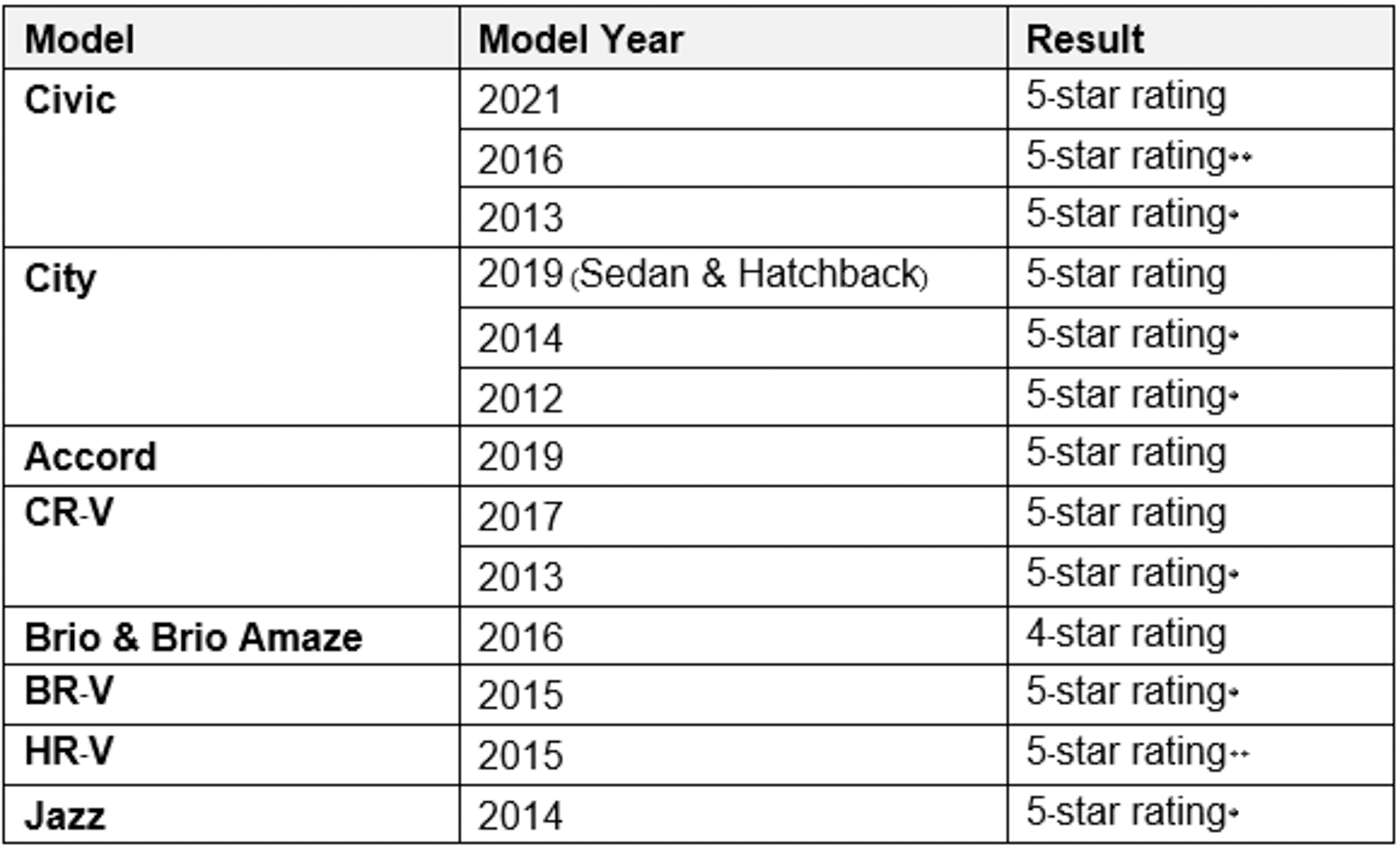 **For the Civic (MY2016) and HR-V (MY2015) rating, variants without SBR (Seatbelt Reminder) for both front occupants are rated 4-stars.