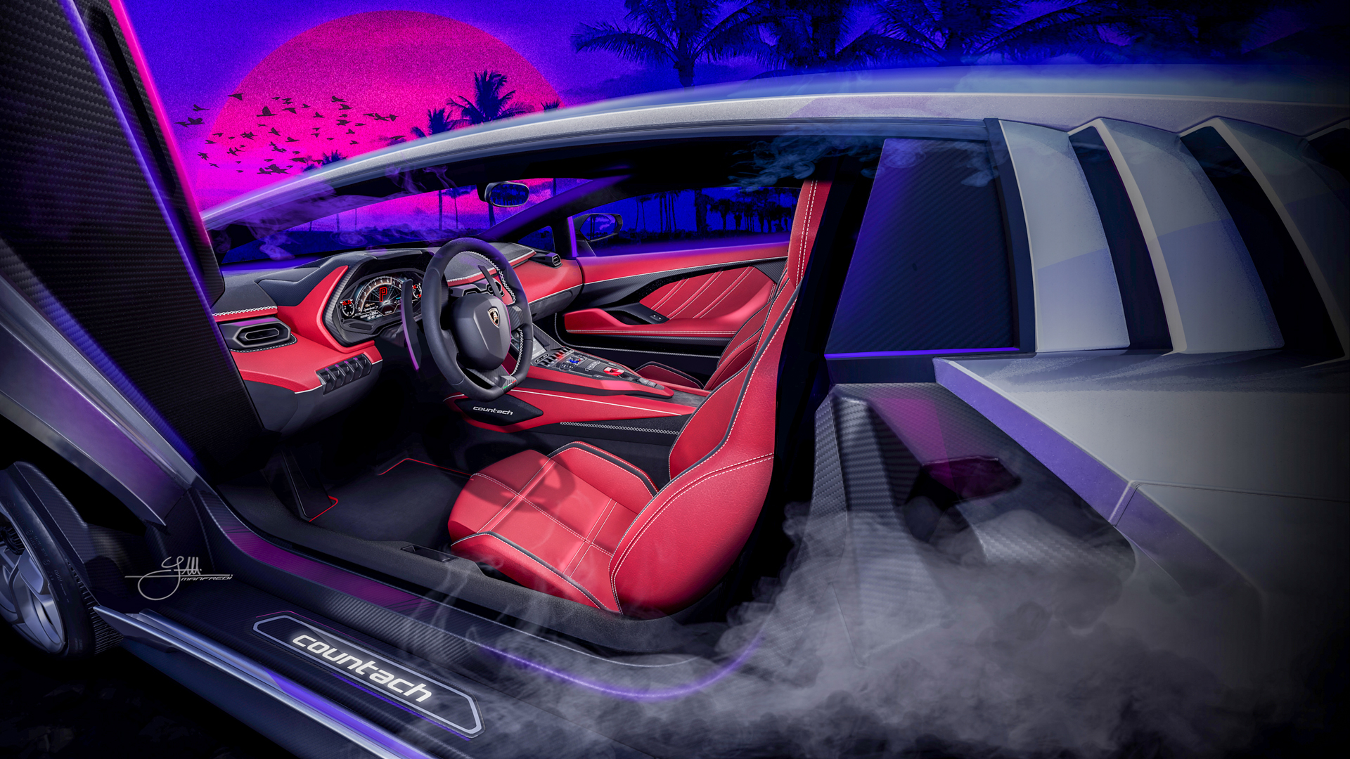 The Countach LPI 800-4 is unveiled today at The Quail, USA in a dedicated color Bianco Siderale, containing a hint of pearlescent blue and reminiscent of Ferruccio Lamborghini’s own Countach LP 400 S, complete with red and black leather heritage interior. The interior also takes design cues from the original Countach within the context of a modern car. The classic and luxurious leather features geometric stitching on the specially designed comfort seats and dashboard, sporting a square motif referencing the bold style and optimism of 1970s design and technology.