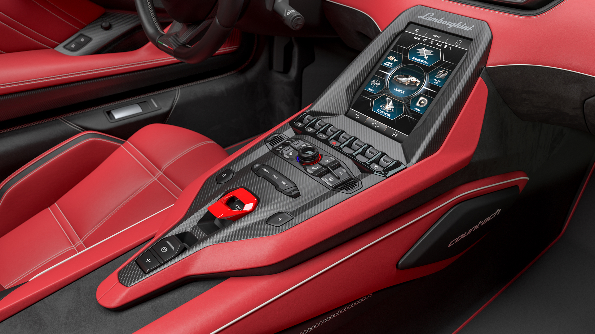 An 8,4” HDMI center touchscreen unique to the LPI 800-4 manages car controls including Connectivity and Apple CarPlay. It also includes a unique button entitled ‘Stile’ (Design): pressed, it explains the Countach design philosophy to its privileged audience.