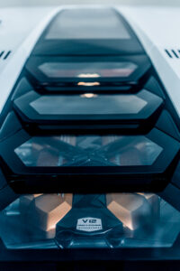 The V12 engine of the Countach is as legendary as the design. Mounted longways at the rear together with its forward-cabin layout, the original Countach featured side-mounted radiators from Formula One; forward-facing gearbox and tubular spaceframe technology. It was as revolutionary in its approach to sports car engineering as in its astonishing looks, with its engine position chosen for weight distribution and balance and of course, the aspirated twelve cylinders delivering the most emotive top performance. The Countach developed the best available technologies to produce an extraordinary car: this visionary philosophy is reflected in the Countach LPI 800-4, taking the pinnacle of current Lamborghini technologies and engineering to produce the performance expected from a Countach in 2021.
