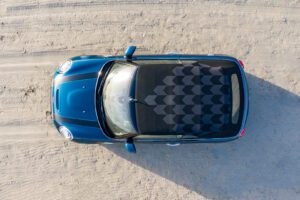 The MINI Yours Softtop Sidewalk offers protection against precipitation or when the sun is simply beating down too strongly. The version of the fully automatic textile soft top, specially designed for the edition model, which can be opened or closed electrically and almost silently in 18 seconds, features an artistically woven-in arrow graphic in the particularly high-quality finish typical of MINI Yours.