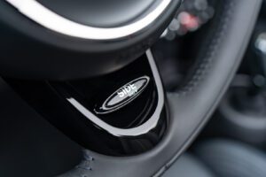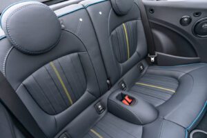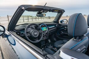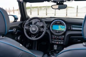 The interior surfaces of the MINI Convertible Sidewalk Edition also have a model-specific design. The backlit decorative trim on the passenger side in Piano Black is combined with accents in petrol and silver. In addition, the elliptical door trim is in Petrol. The sports leather steering wheel with its discreet “Sidewalk” logo at the bottom and contrasting seams is a further highlight in edition model’s interior.