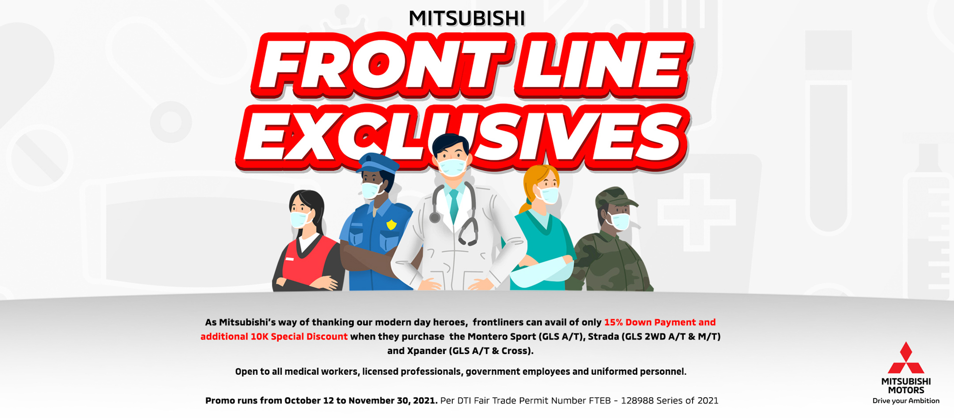 For more information about the Mitsubishi Front Line Exclusive Promo, visit www.mitsubishi-motors.com.ph or contact your preferred dealer. Per DTI Fair Trade Permit No. FTEB-128988 Series of 2021.