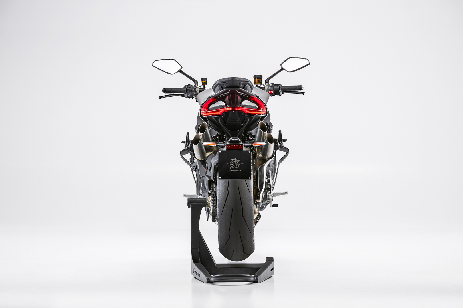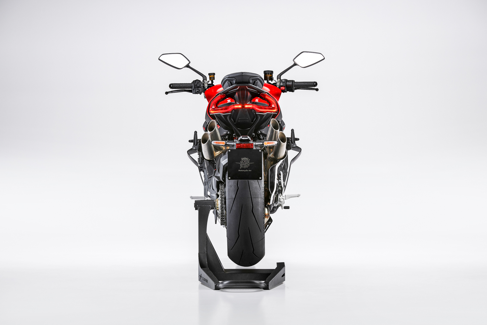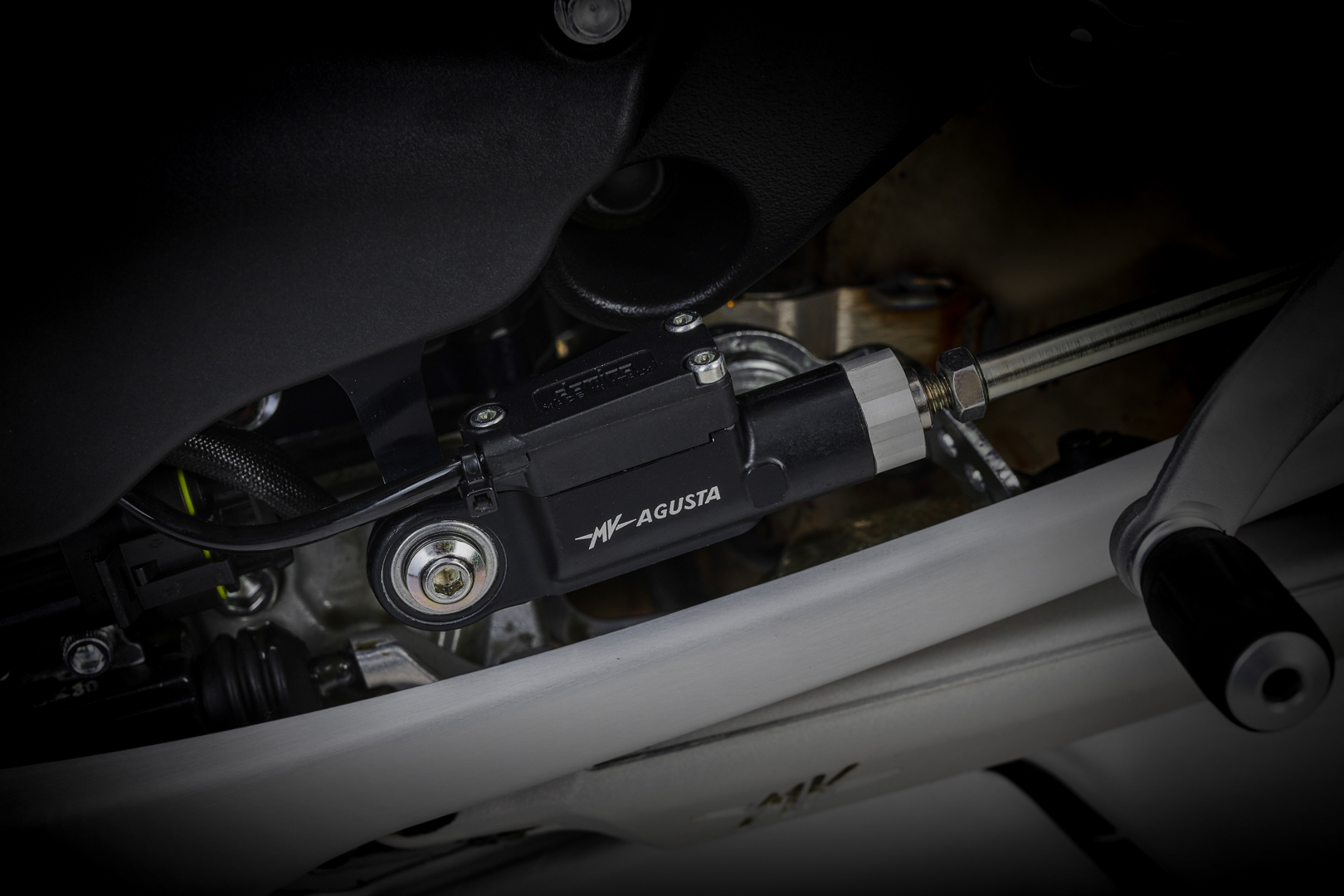 The new MV Agusta Brutale 1000 RS is powered by an extraordinary engine, which adopts high-end materials. A clear example of this is the titanium connecting rods, a one-of-a-kind solution within the naked segment. Titanium is also used for both the intake and the exhaust valves, thus underlining a technical setting that improves output and boosts torque, worthy of a true superbike. The central timing chain is the latest evolution of what was developed on the 1000 RR. It adopts a further optimised camshaft timing and aimed at making the torque curve at med-low revs even more effective. The use of the DLC (Diamond Like Carbon) coating for the valve control tappets reduces friction and enhances reliability. This goal is achieved also thanks to the use of specific gears for the primary drive; the whole transmission is particularly resistant and reliable, especially in the extreme starts guaranteed by Launch Control. The third generation EAS 3.0 (Electronic Assisted Shift) sees the introduction of an additional sensor, to ensure more precise and smoother shifting. The four-outlet exhaust, an unmistakable MV Agusta stylistic touch, is characterized by the sound-design of the main manifold, which emphasizes the immediately recognizable Brutale tone, in full compliance with the Euro 5 regulations.