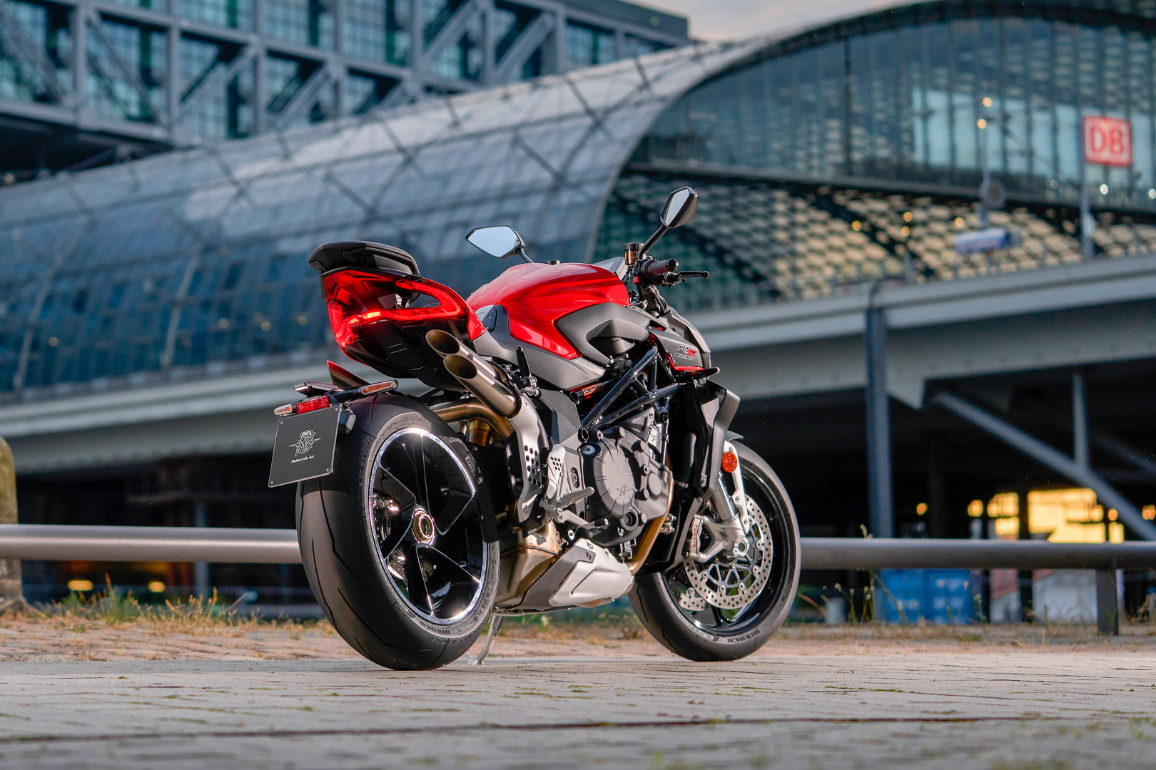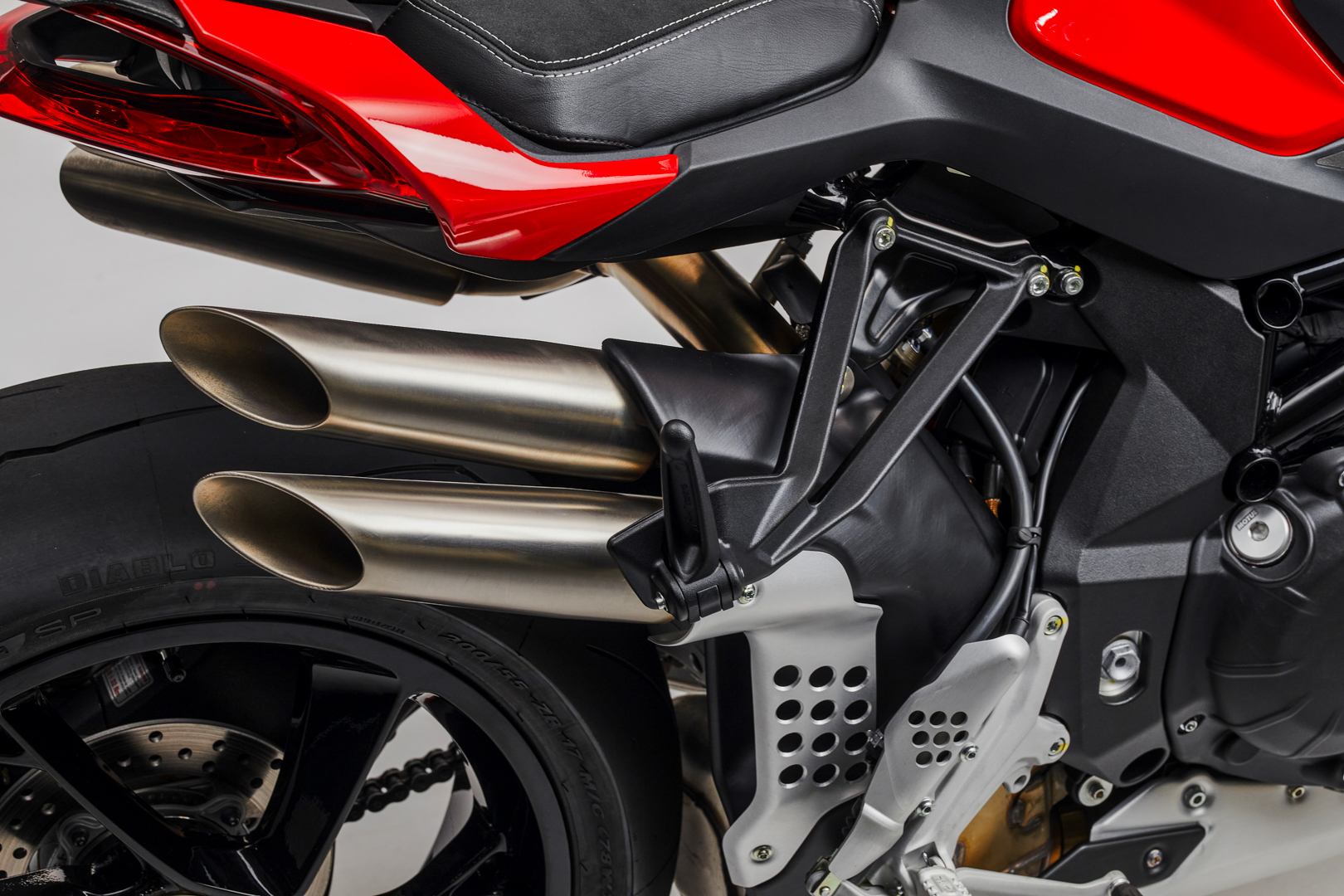 The Marzocchi fork and the Sachs single shock absorber, both adjustable, ensure superior performance in fast riding and meanwhile guaranteeing an excellent comfort when getting around for on-asphalt adventures. The on-board comfort is further enhanced by the the new one-piece saddle featuring a softer padding, not to mention the revised clip-on handlebars – another distinctive trait of the Brutale – which now result raised compared to those of the Brutale RR. The rider can even count on specifically developed