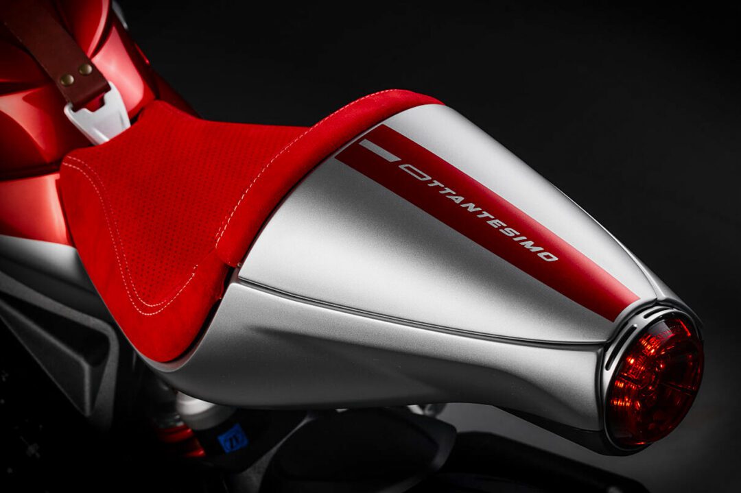 The F3 RR Ottantesimo includes a special kit with an Akrapovich exhaust (boosting total power to 155 HP at 13,250 rpm), a carbon-fiber silencer cover, CNC-machined fuel cap, and passenger seat cover.