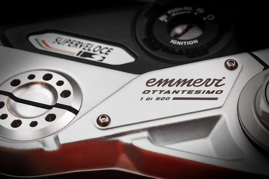 To honor this history, MV Agusta presents six commemorative models, all produced in a limited series of only 500 units, recognizable by the laser engraving on the triple clamp or tank protection plate, 1 di 500, depending on the model. Each bike dedicated to the 80th Anniversary is delivered with a respective certificate of authenticity.