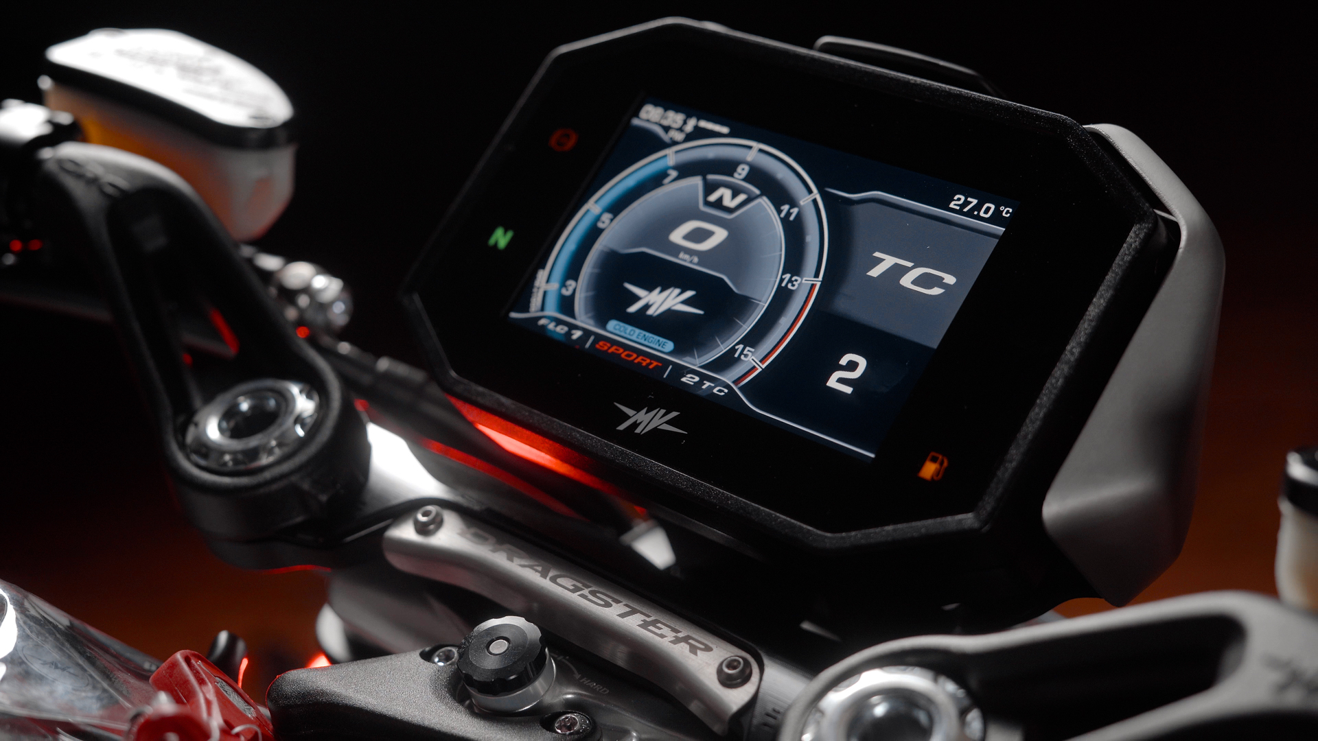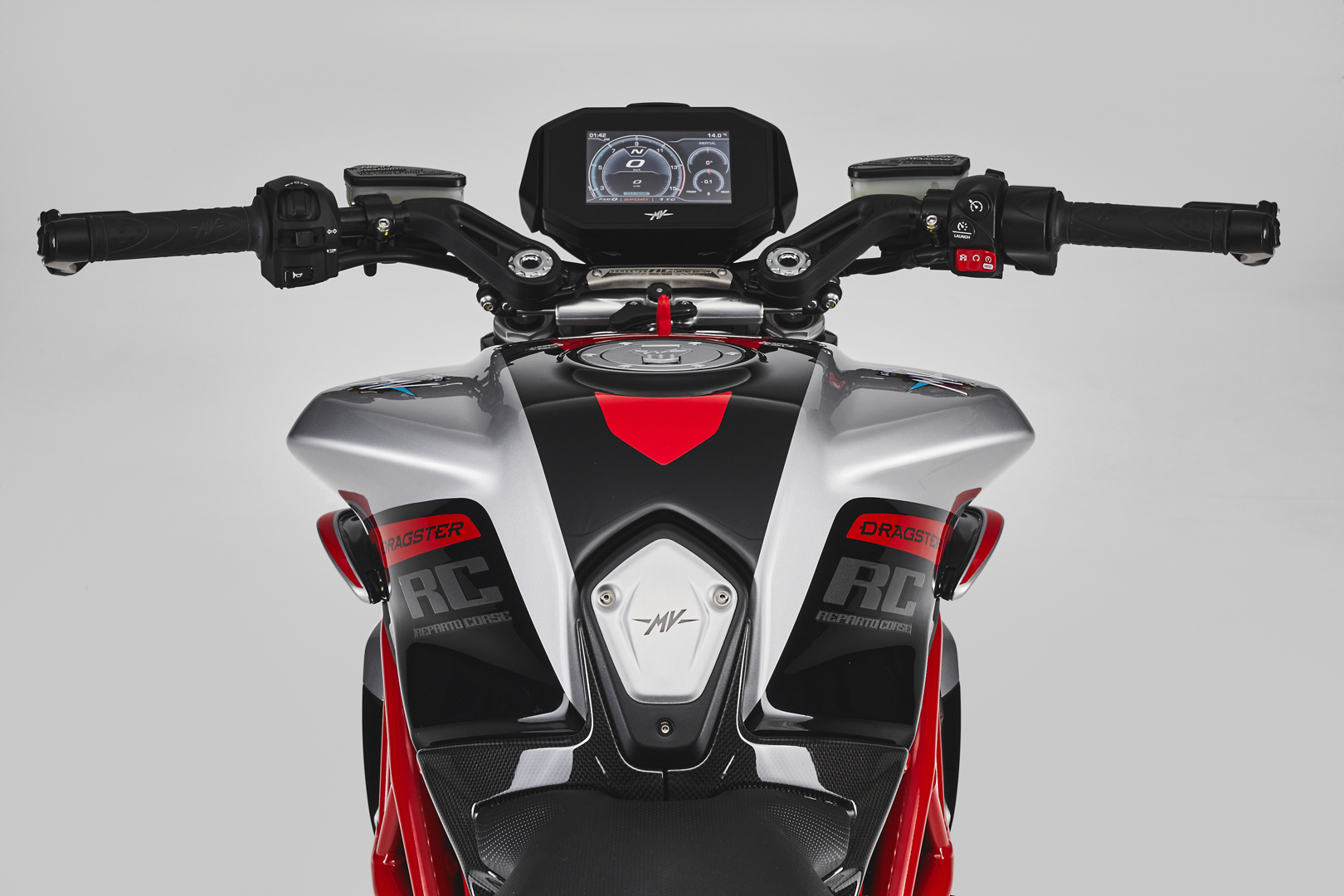 The ABS, now developed by Continental, features the cornering function, and the TC slip control works as function of lean angle. Also, thanks to the IMU, the revolutionary FLC front lift control can now execute a controlled wheelie instead of entirely preventing it, maximizing acceleration.The future of technology before your eyes. All the Dragsters benefit from the new 5.5” TFT dashboard which communictes with the MVRide App. This app can be used, not only to customise every aspect of the bike directly from your Smartphone. Also, you can share your trips on your favourite social media platform. The mirroring function allows navigation with corner-by-corner directions in addition to route recording and sharing. These features were previously only found on the Brutale 1000 RR. The handlebar controls have a new left-hand block with joystick for browsing through the various dashboard menus and FLC + speed limiting functions on the right hand control.