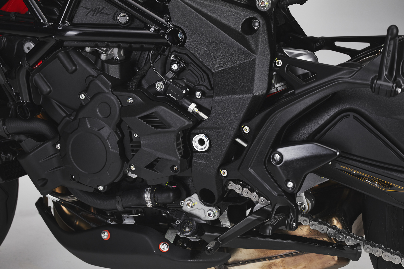 The three-cylinder engine was subject to relentless development activity. The counter rotating crankshaft, unique in the segment, defines its character. With maximum power of 140 HP, the MV Agusta triple remains one of the most powerful in its class.