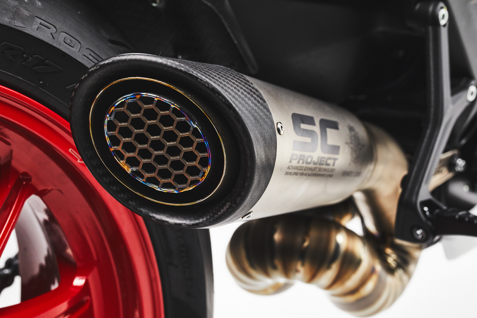 teams. The forged wheels drastically reduce unsprung weight, raising the agility level, which is already at the top of its class thanks to the engine with its counter-rotating crankshaft. High quality carbon is used for some of the aesthetic elements such as the front mudguard supports, the fuel tank side panels and the rear mudguard. Dragster RC SCS takes the performance of the 800 three-piston engine to the extreme, thanks to the optional racing kit that includes the SC Project exhaust tailpipe and optimised mapping. Only 200 numbered and certified Dragster RC SCS units will be available.