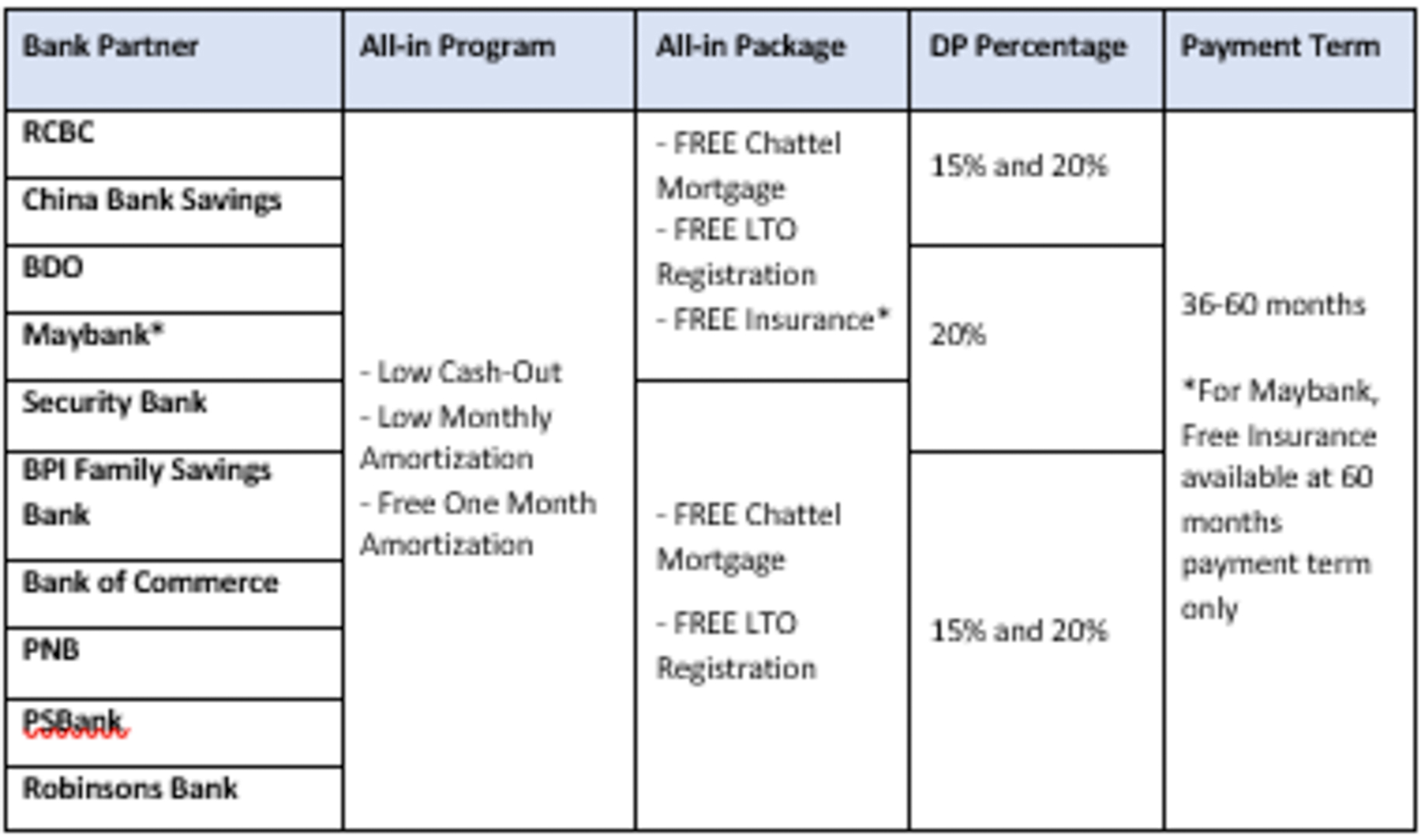 Moreover, customers are entitled to different financing promo offers such as low cash-out, low monthly amortization, free one (1) month amortization at 15% and 20% all-in downpayment offers, available with the following bank partners: