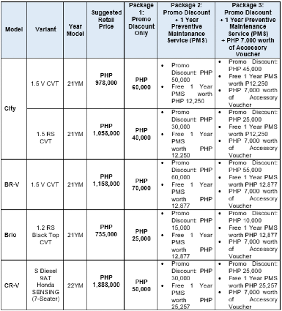 Free One (1) Year PMS and accessory vouchers shall be given to the customer upon the release of the Honda vehicle.