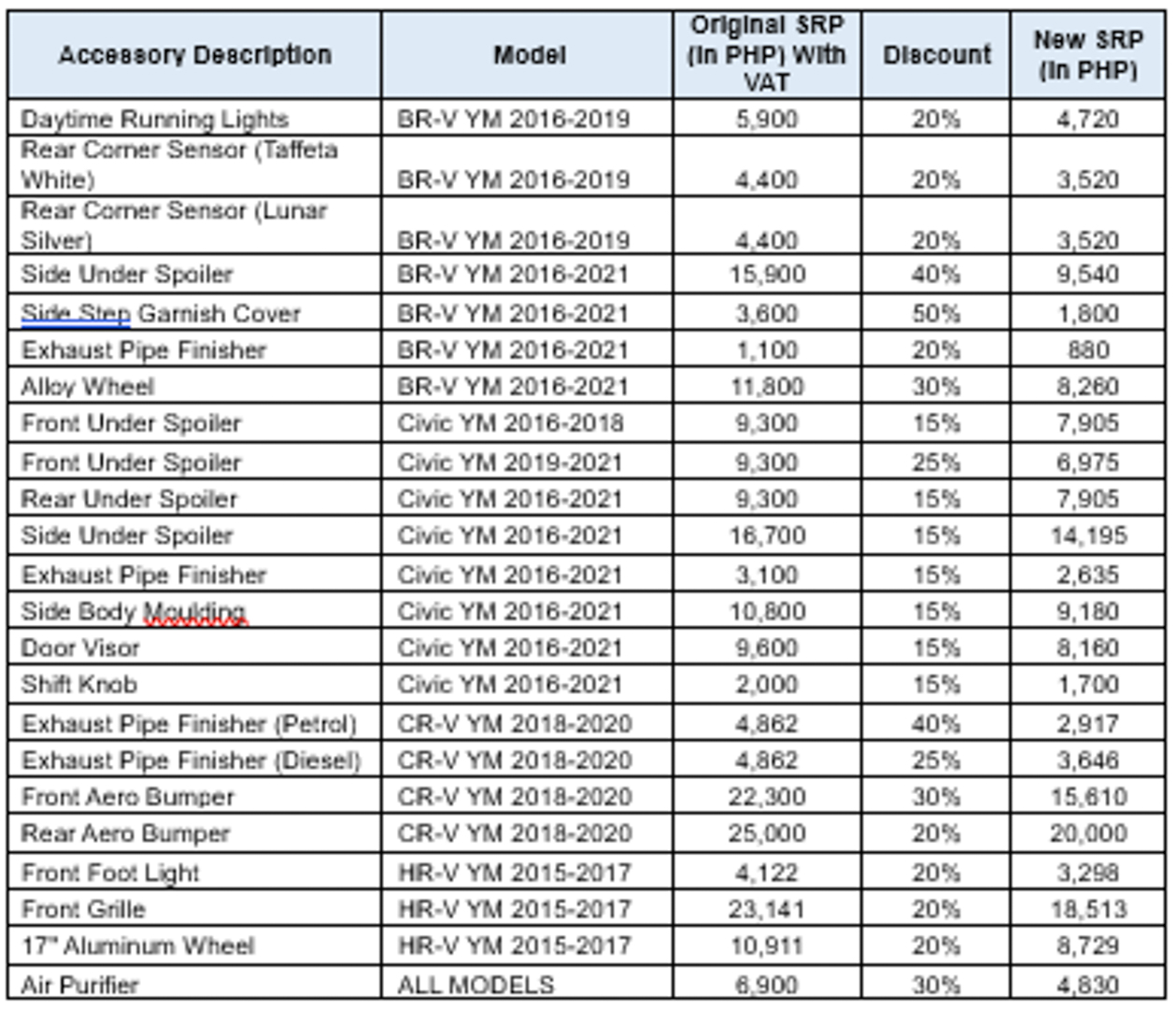 Customers may avail up to 50% off on select car accessories for BR-V, Civic, CR-V, HR-V, and other Honda models at any Honda Cars dealership nationwide.