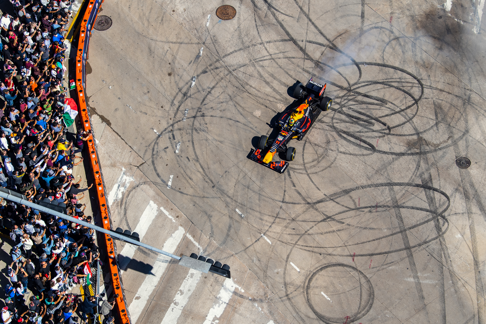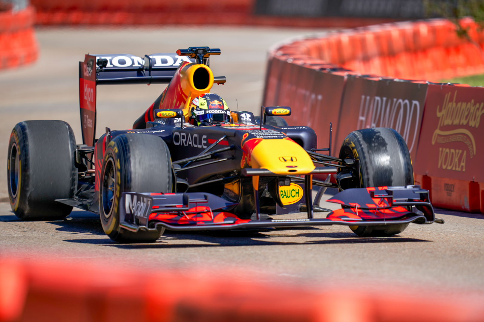 After the RB7 visited New York City for a trip around Manhattan and the Wall Street district in early October, Red Bull Racing Honda moved down to Texas for its next show run. This time, it was Mexican driver Pérez who got behind the wheel of the iconic RB7 car to give fans a treat fresh off the back of his third place behind teammate Max Verstappen at the Turkish Grand Prix. The 31-year-old proved everything is bigger in Texas as he piloted the RB7 in multiple runs through the twists and turns of Harwood District including a performance by stunt bike star Aaron Colton.