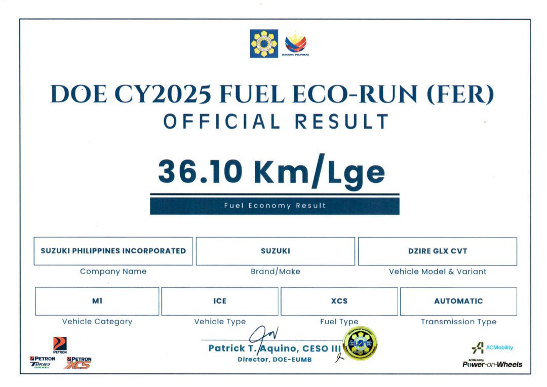 According to official DOE results, the Suzuki Dzire Hybrid GLX CVT achieved an impressive 36.10 km/L gasoline-equivalent fuel economy, setting a benchmark for class-leading efficiency in both city commutes and long-distance drives.