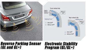 The vehicle features an electric fold and adjust outside door mirror, reverse parking sensors, and an additional upgrade safety feature with Electronic Stability Program or ESP. ESP sets the bar for the Dzire as it automatically controls over the engine torque and brakes to suppress wheel slip. This helps the driver to stay in control, especially if it encounters slippery roads or when the car loses traction.