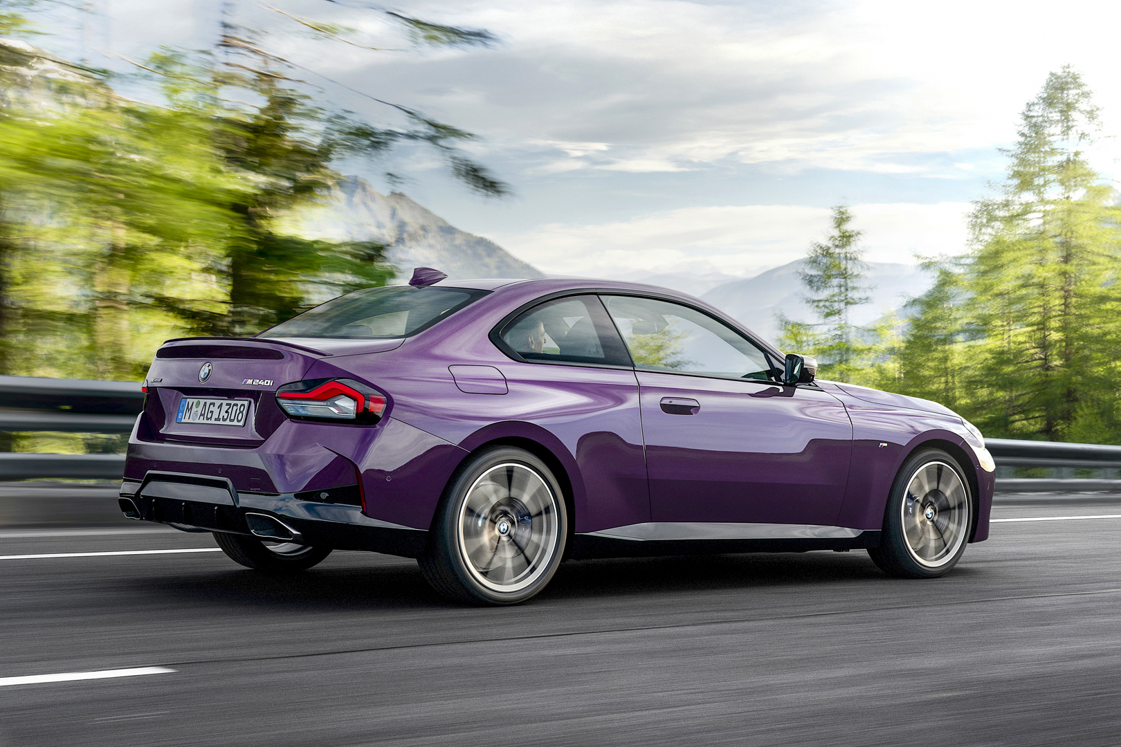 Eye-catching front-end design featuring individual headlights in BMW 02 style and a new-look BMW kidney grille. Vertically arranged active air flaps instead of bars. Sporty and graceful silhouette composed of crisp lines and surfaces sculpted for a muscular feel. Pronounced wheel arch flaring gives the rear a powerful look. Compact rear light units with rearranged LED light functions. Distinctive design accents for M Sport specification and BMW M240i xDrive Coupé.