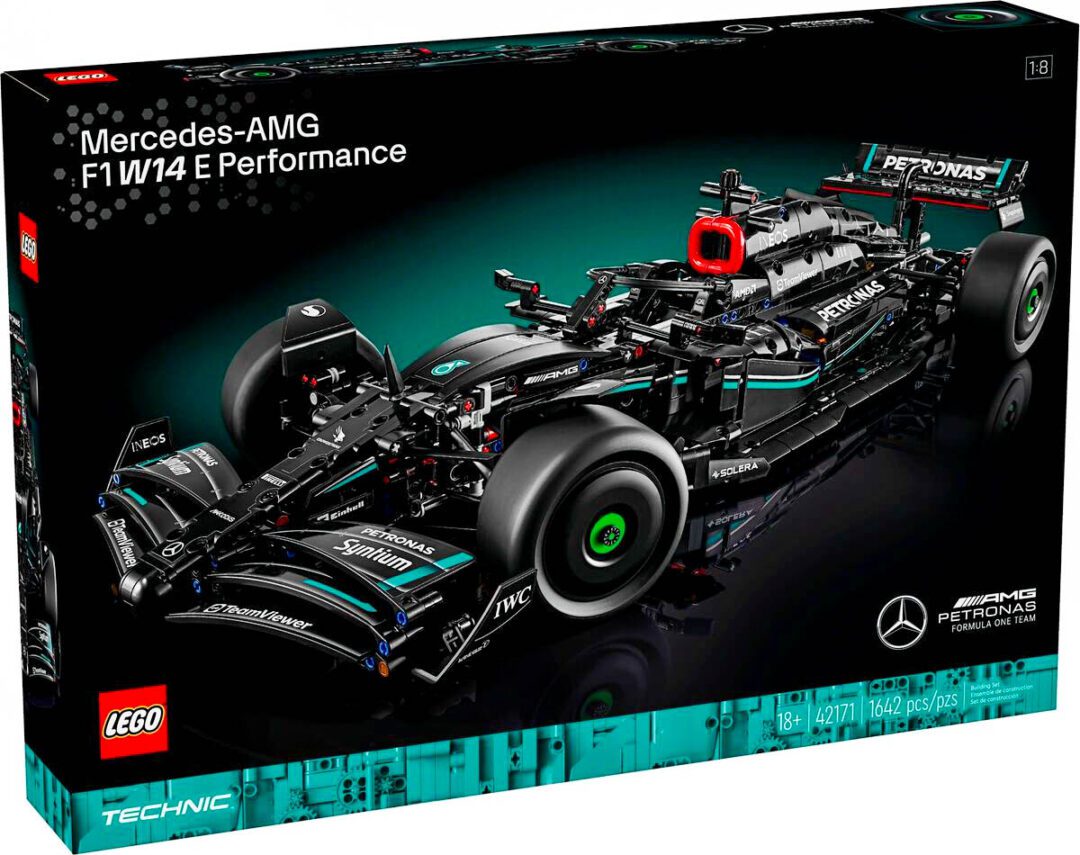 The 42171 Mercedes-AMG F1 W14 E Performance, a 1:8 scale model for adults, features authentic livery details, a working V6 engine with moving pistons that fans can explore up close when removing the engine cover, an opening wing inspired by the real world car’s DRS, individual suspension, functioning steering and slick tires.