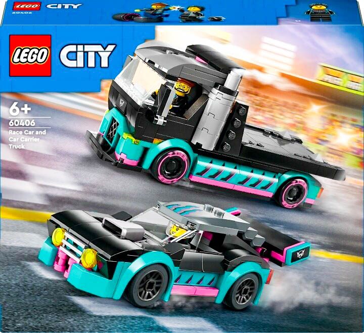 The 60406 LEGO® City Race Car and Car Carrier Truck, on the other hand, includes a race car with sleek ‘slammed-wide’ design featuring lowered suspension and flared fenders for ultimate handling and traction, as well as a transporter with loading ramp to board the racing car. Two minifigure drivers are also part of the set.