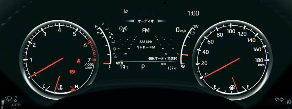 - The upper part of the instrument panel is horizontal, to make it easier to assess body attitude even amid drastic changes in road surfaces. In addition, in order to make it easier to verify vehicle conditions even in harsh road conditions, the panel uses six needle meters, positioned so they can be checked intuitively: speed, rpm, fuel, water temperature, oil pressure, and voltage.