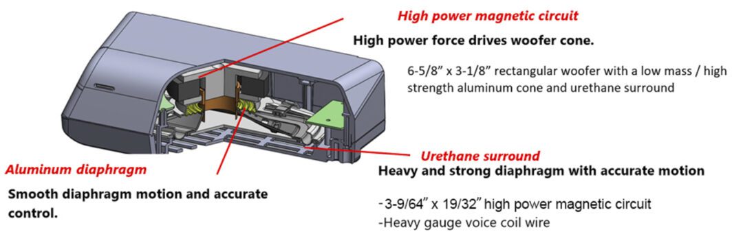 On the business side of the enclosure, the TS-WX010A features a 6-5/8” by 3-1/8” rectangular woofer with a low mass / high strength aluminum cone, urethane surround and high-power magnetic circuit housed in a down firing sealed enclosure made of high-grade resin. The compact subwoofer is powered by a built-in Class D amplifier that is rated at 50 watts RMS output (160 watts maximum). There is a full grille and down firing structure for cone protection for those wayward passenger shoes.